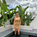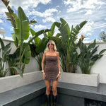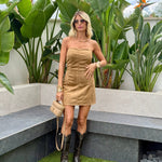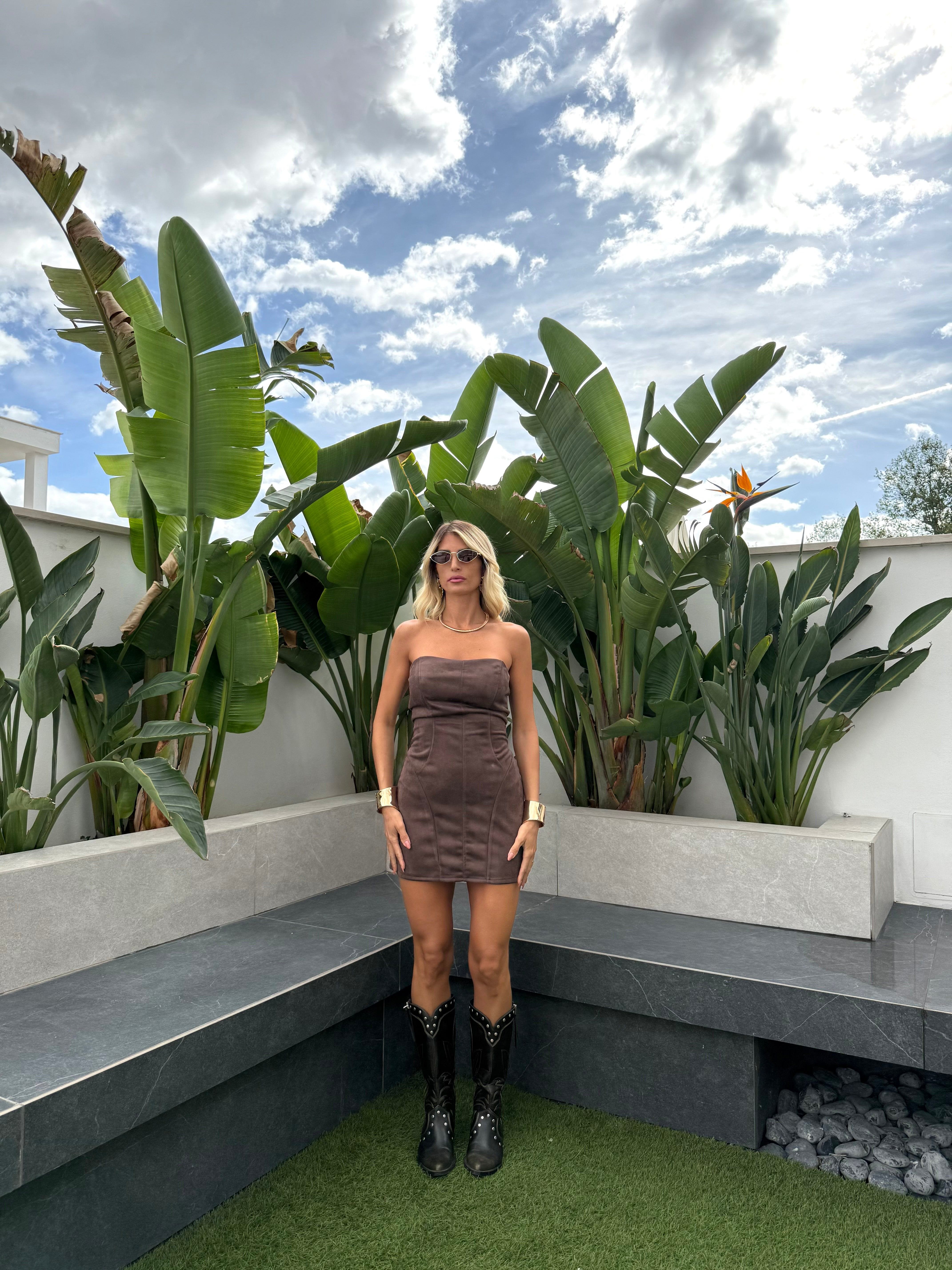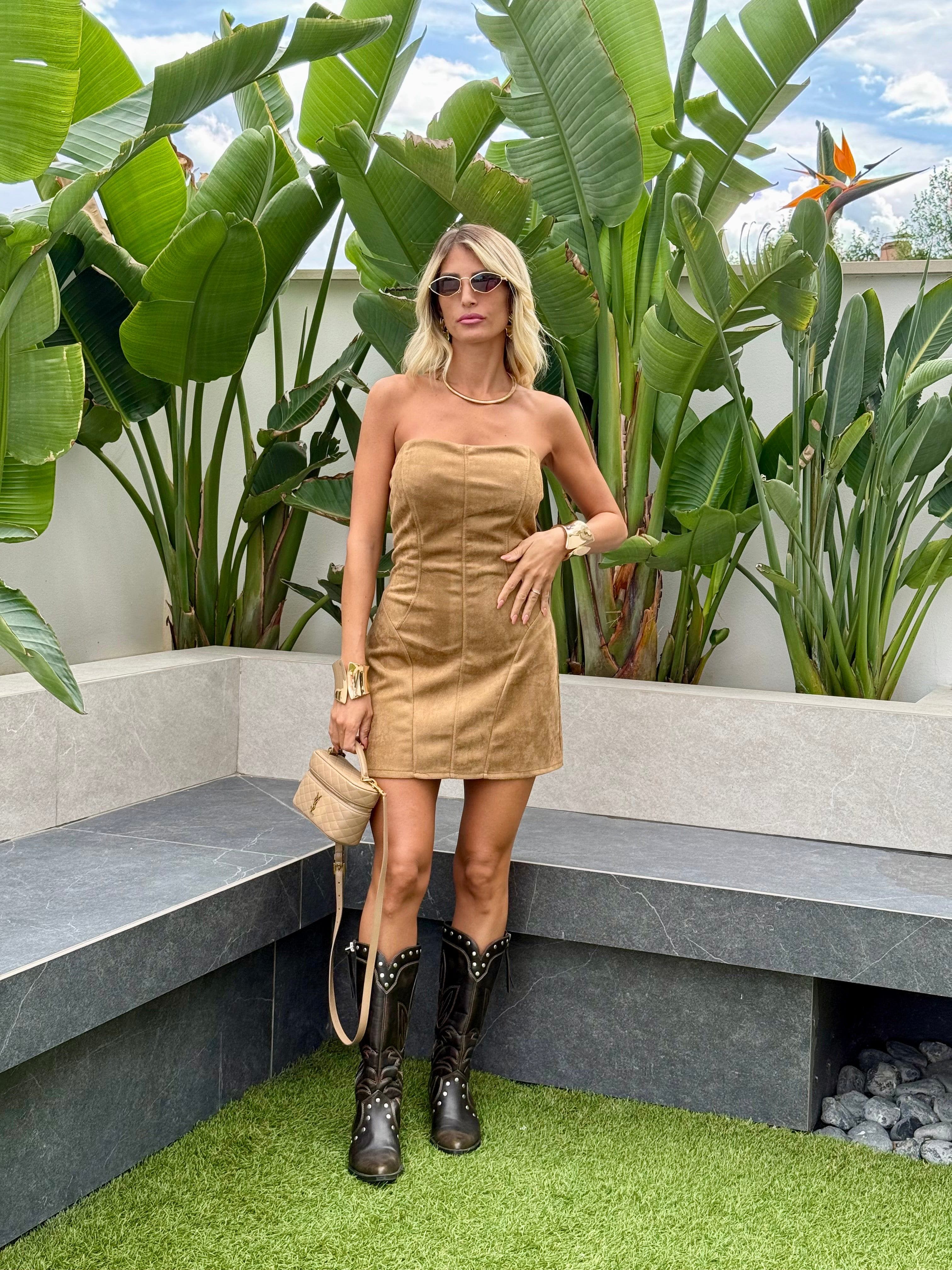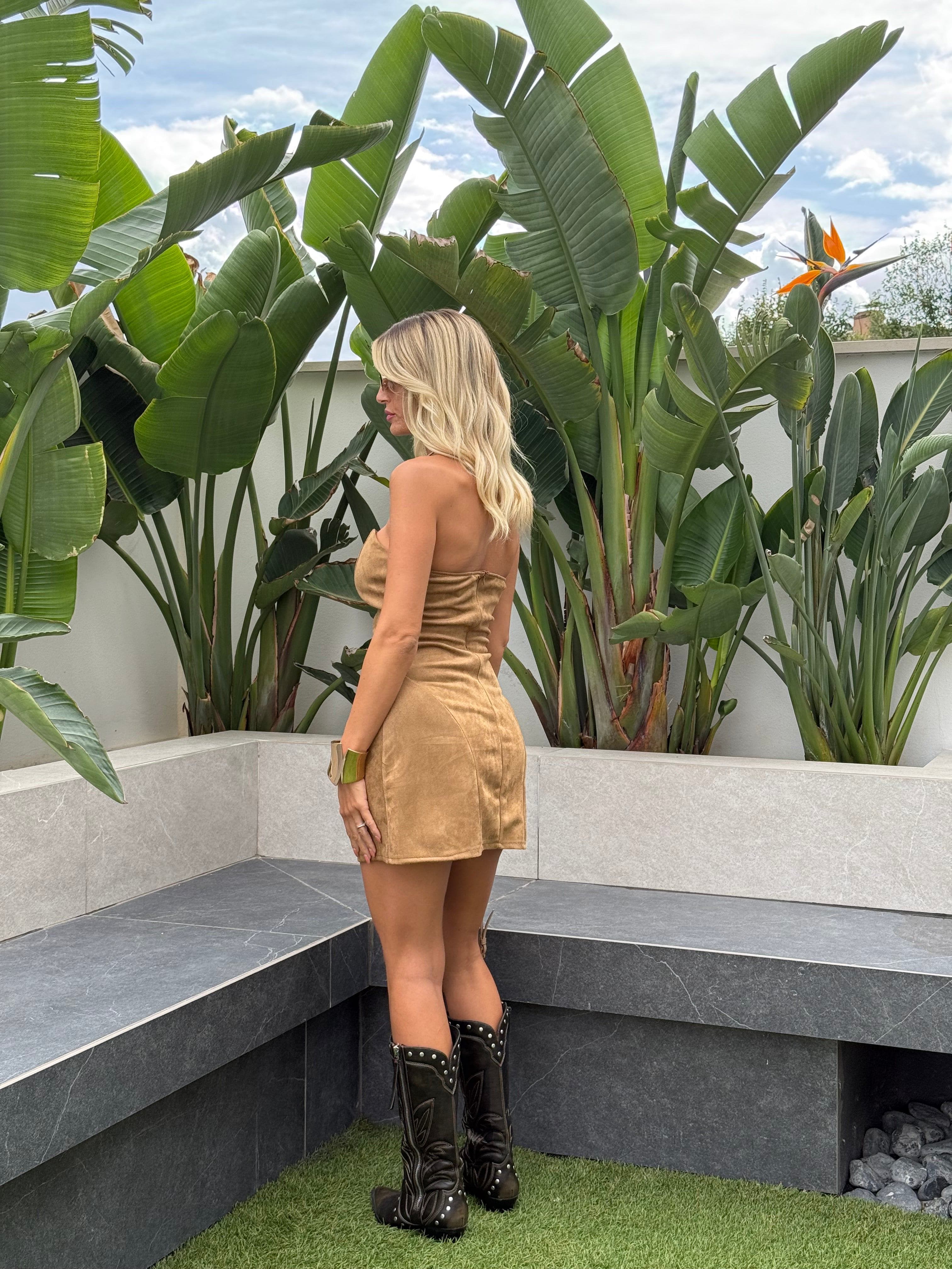 Vestito scamosciato con scollo a cuore, con elastico e zip sul retro