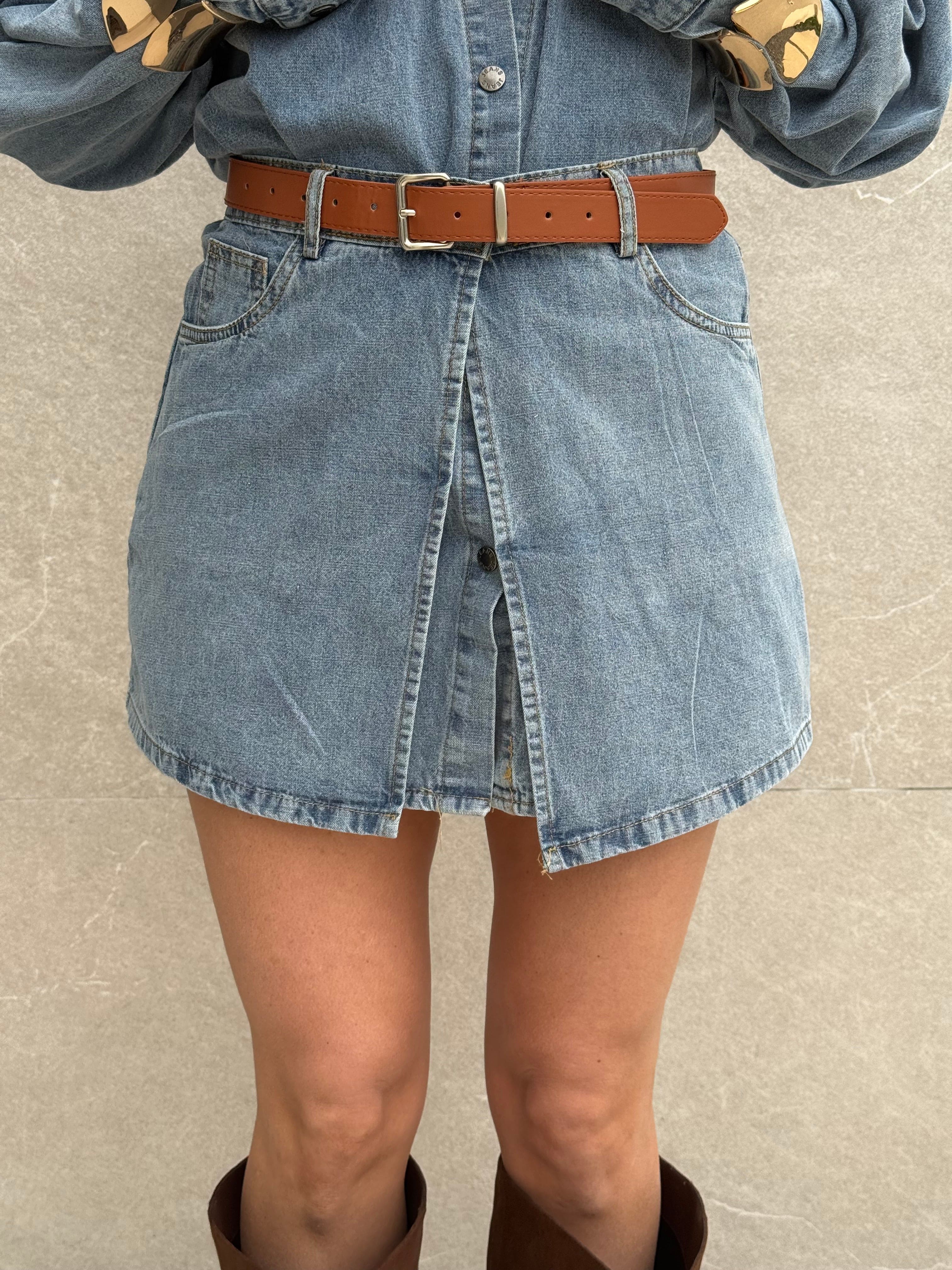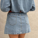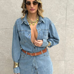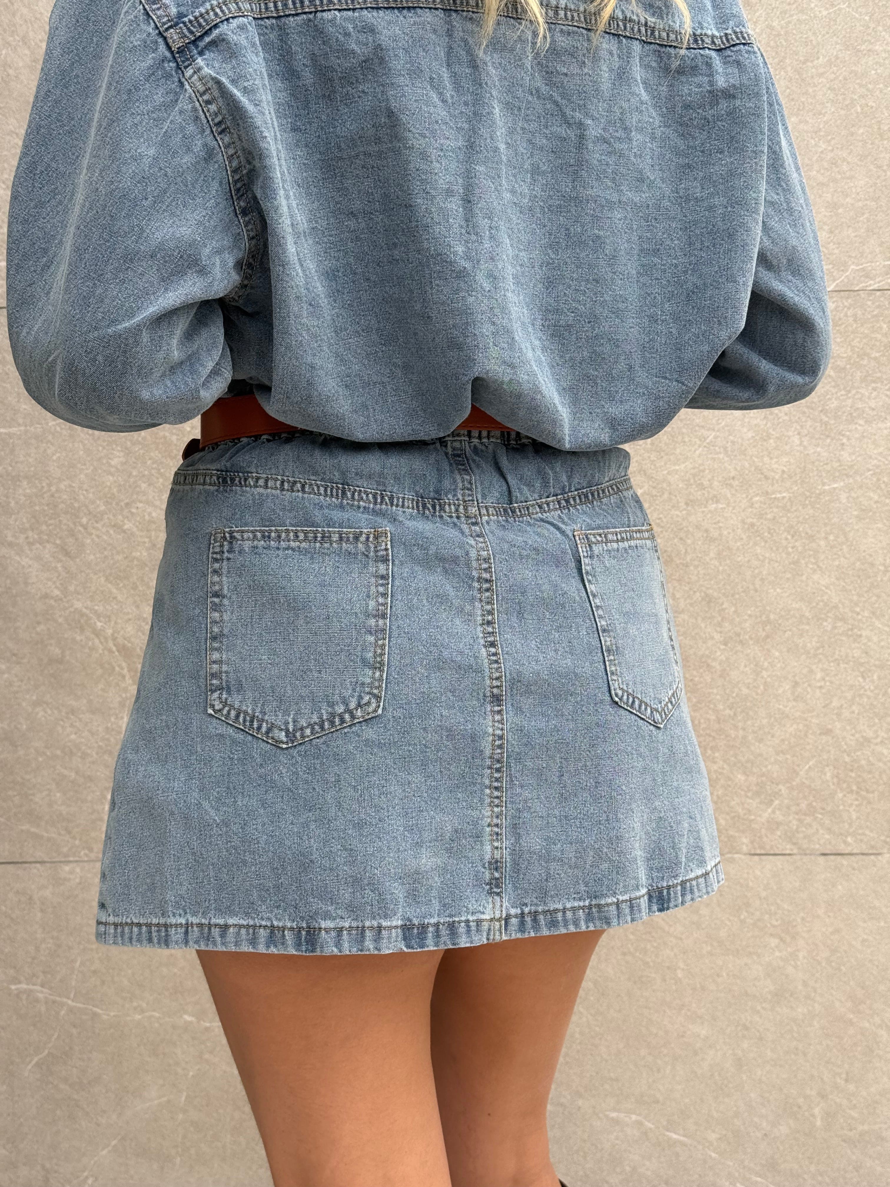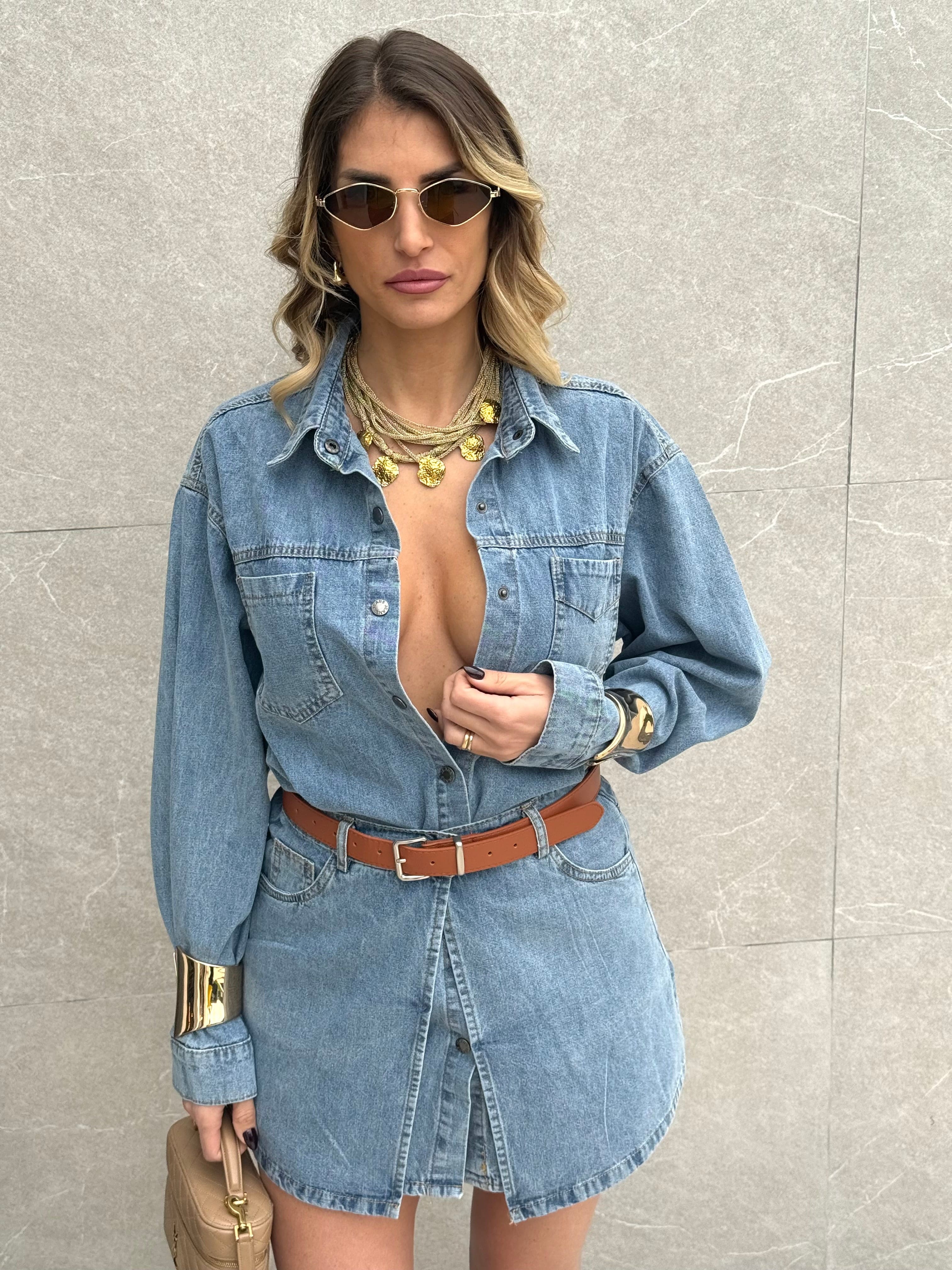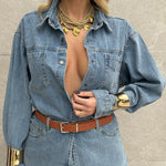 Coordinato denim composto da Camicione con bottoni a clip sul davanti e gonna con elastico in vita taglia unica.