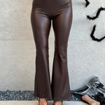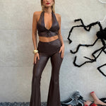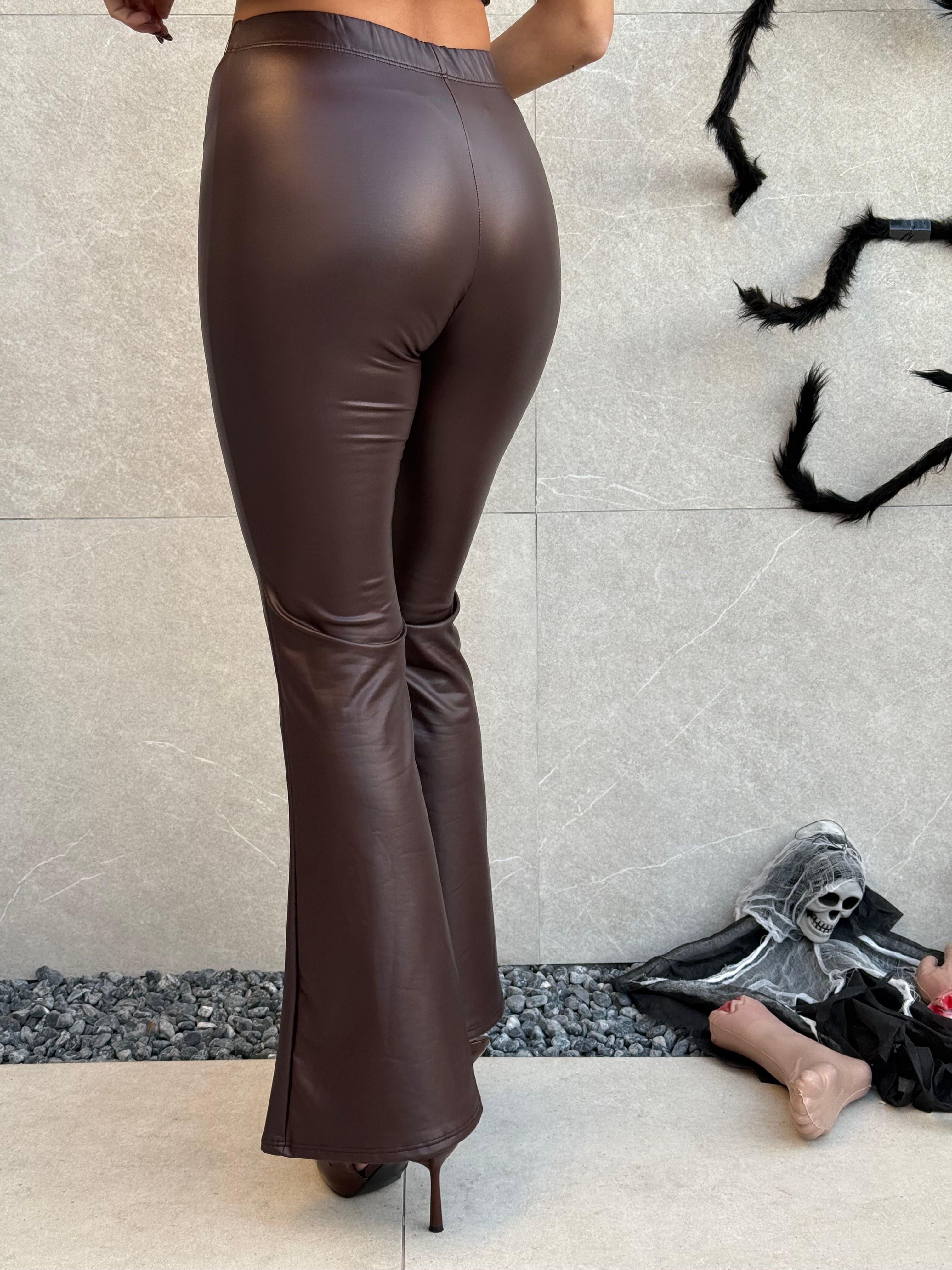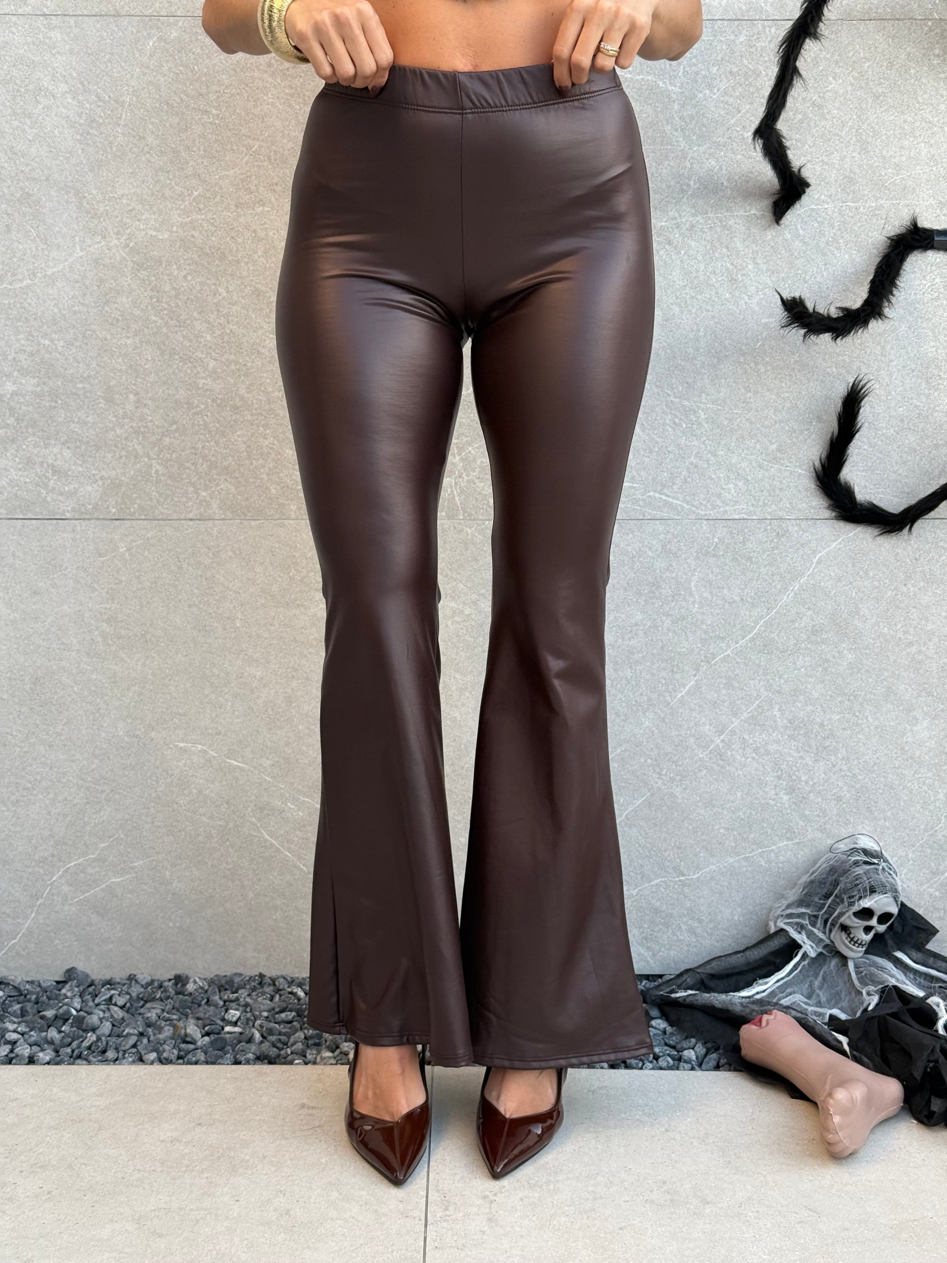 Coordinato in ecopelle composto da pantalone a zampa con elastico in vita e top