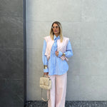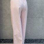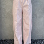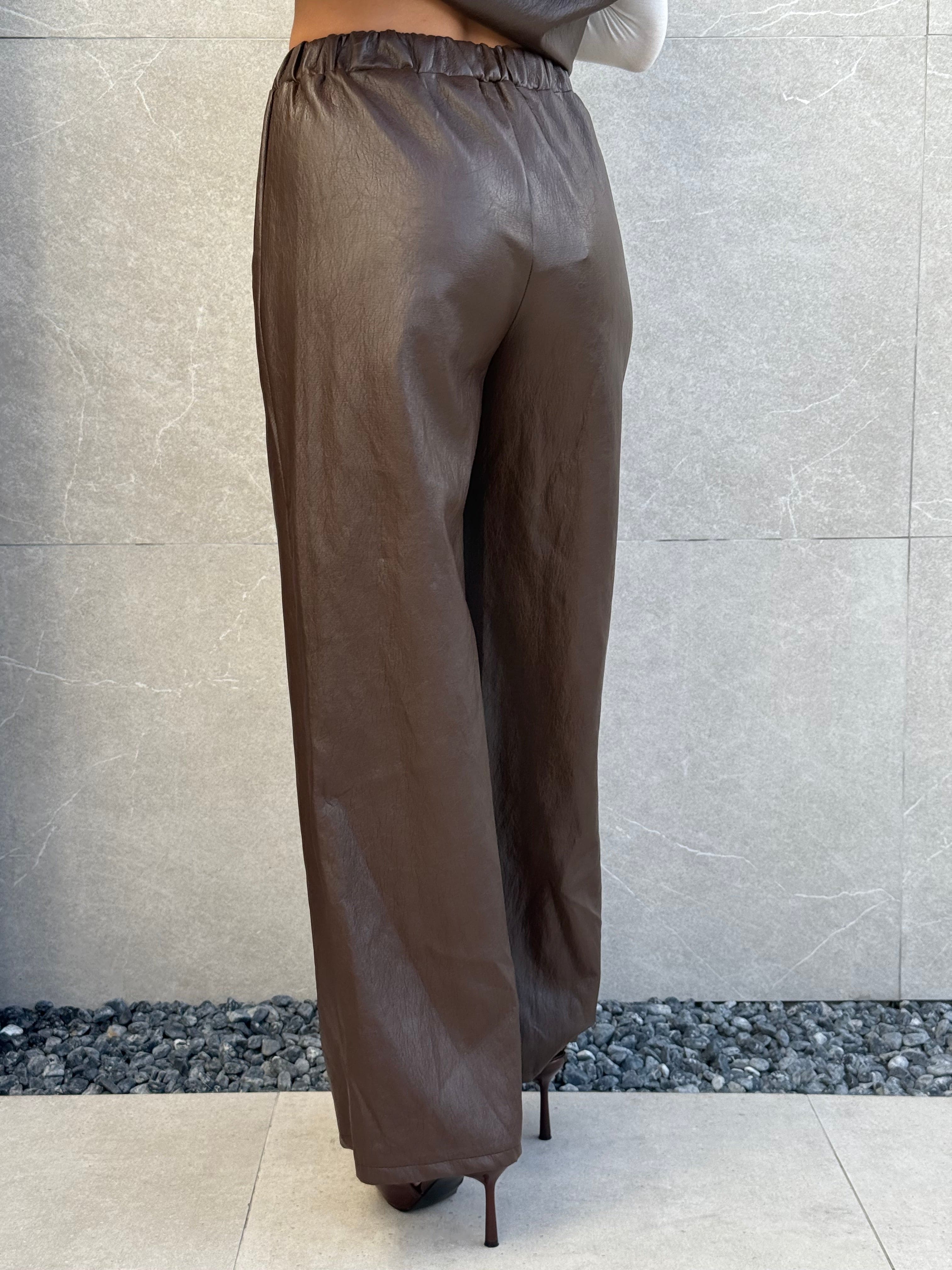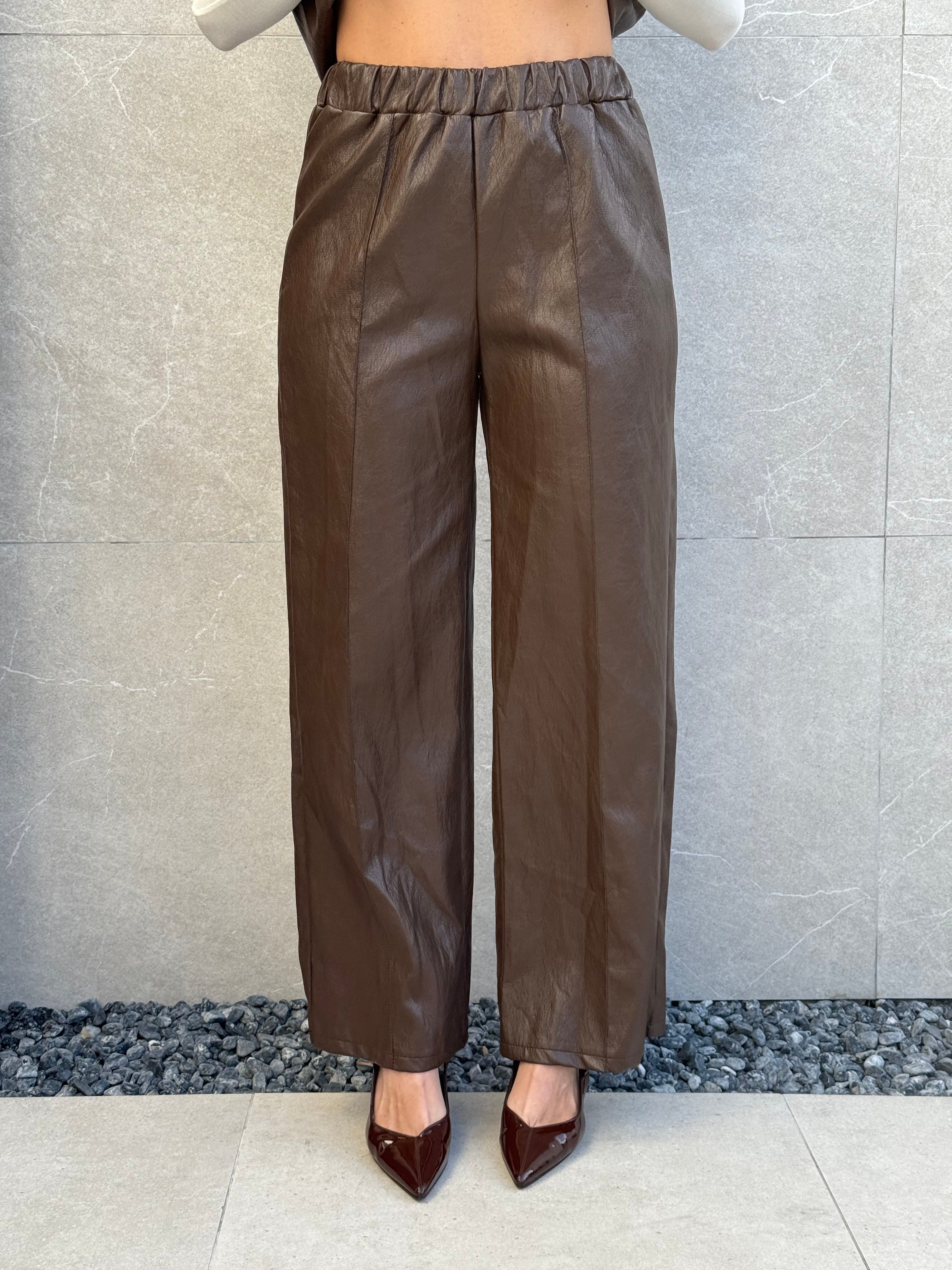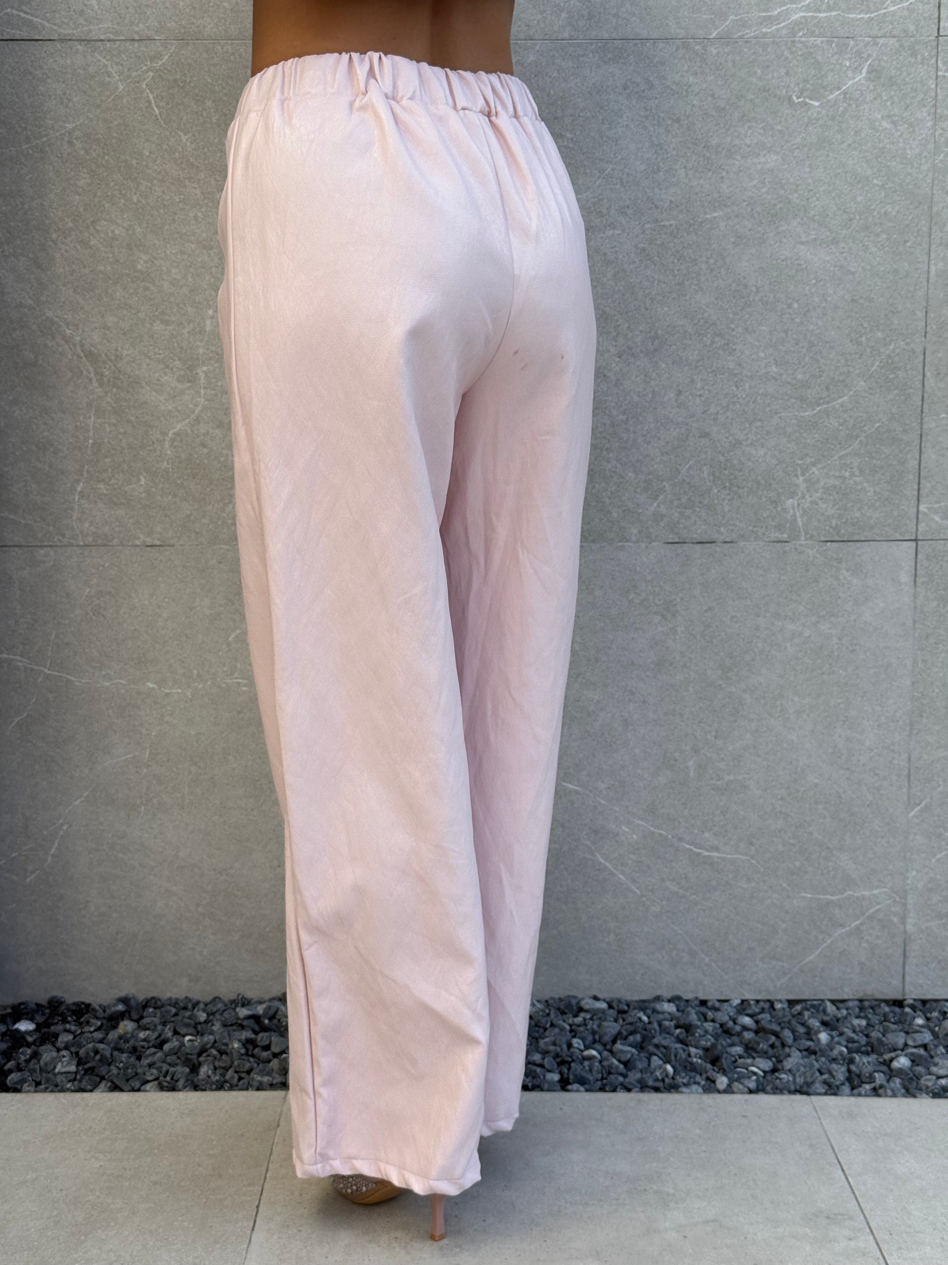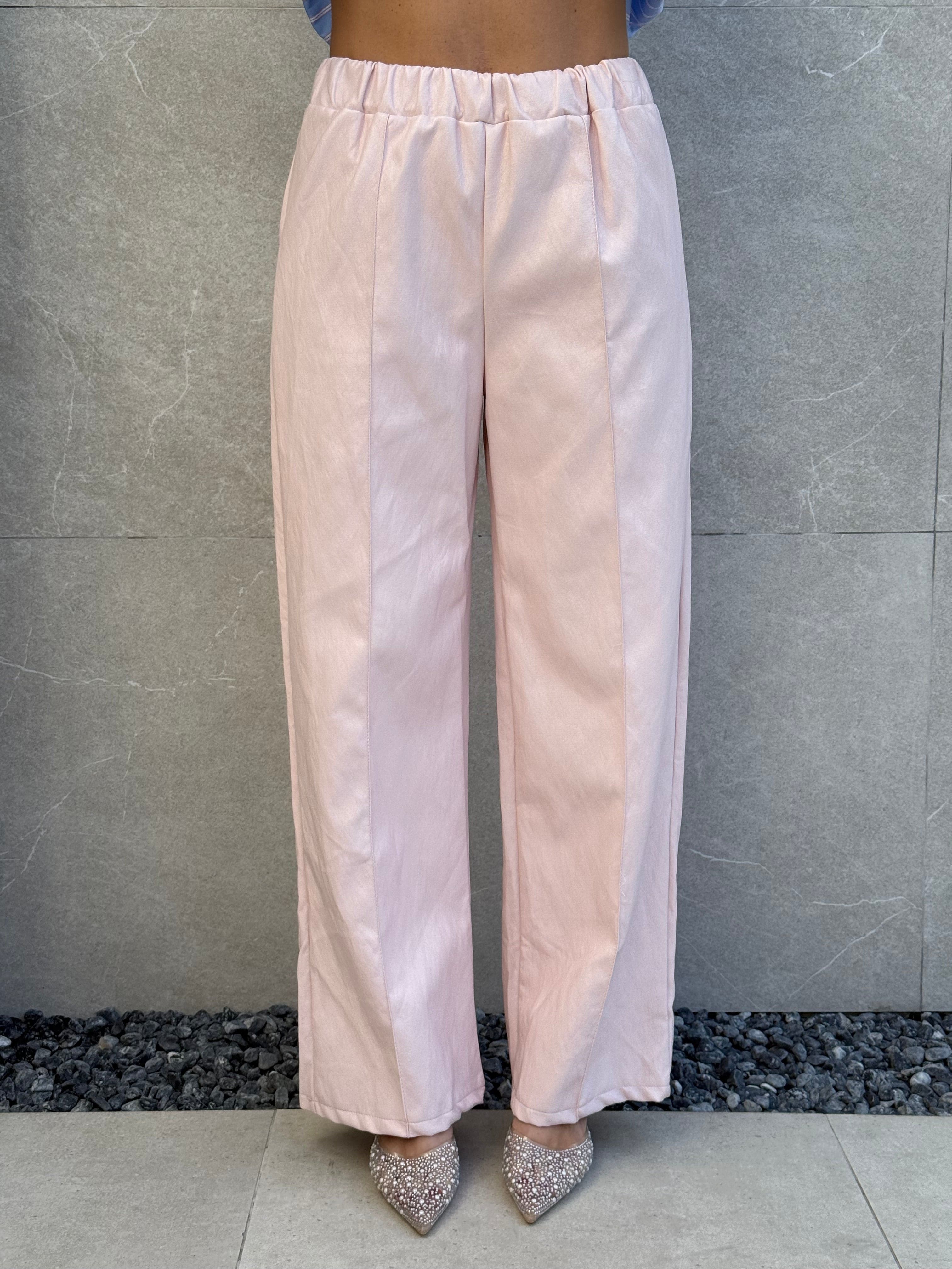 il pantalone è a palazzo e ha l’elastico in vita.