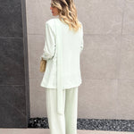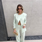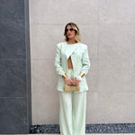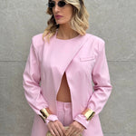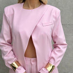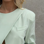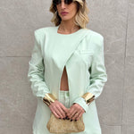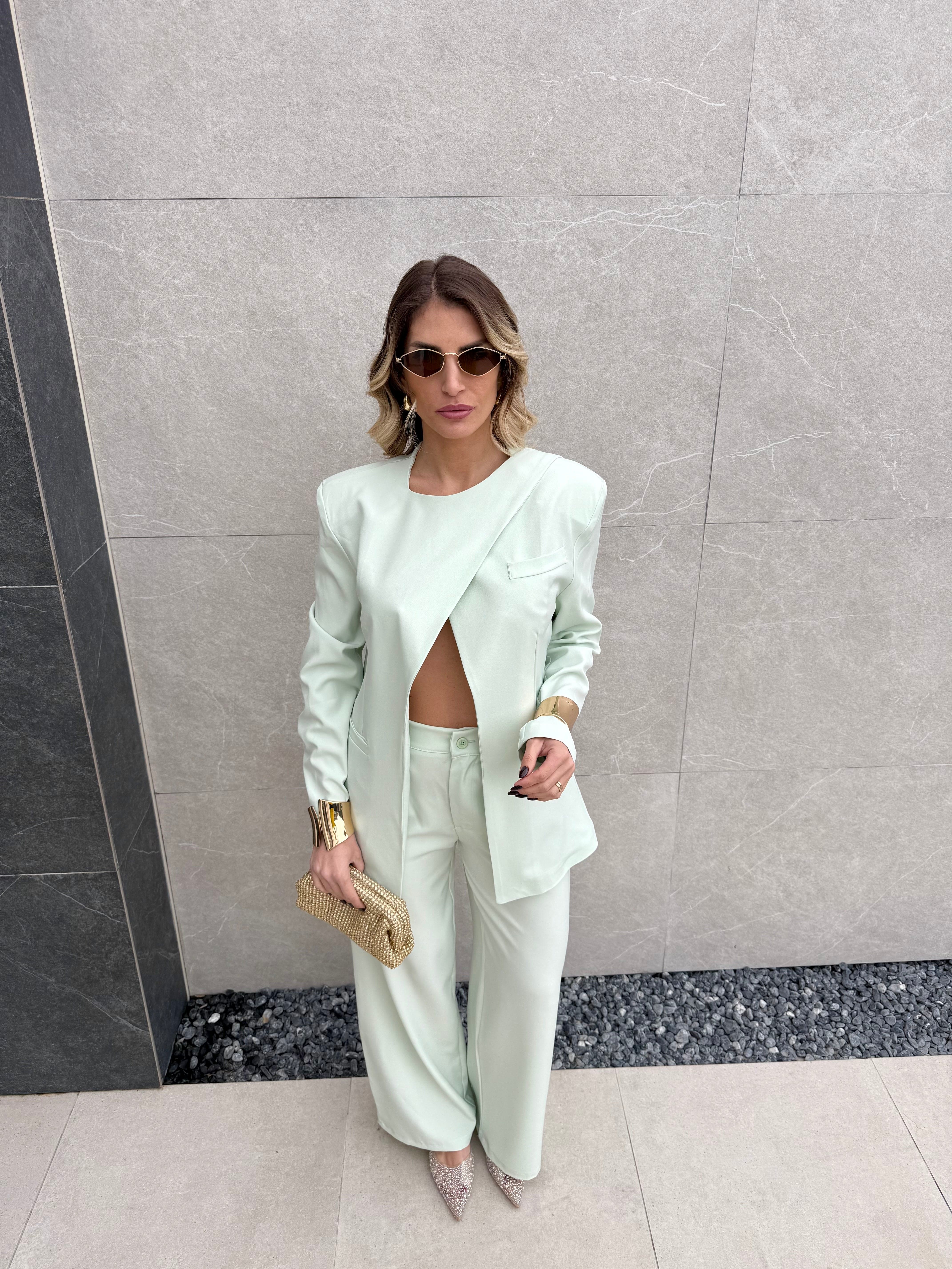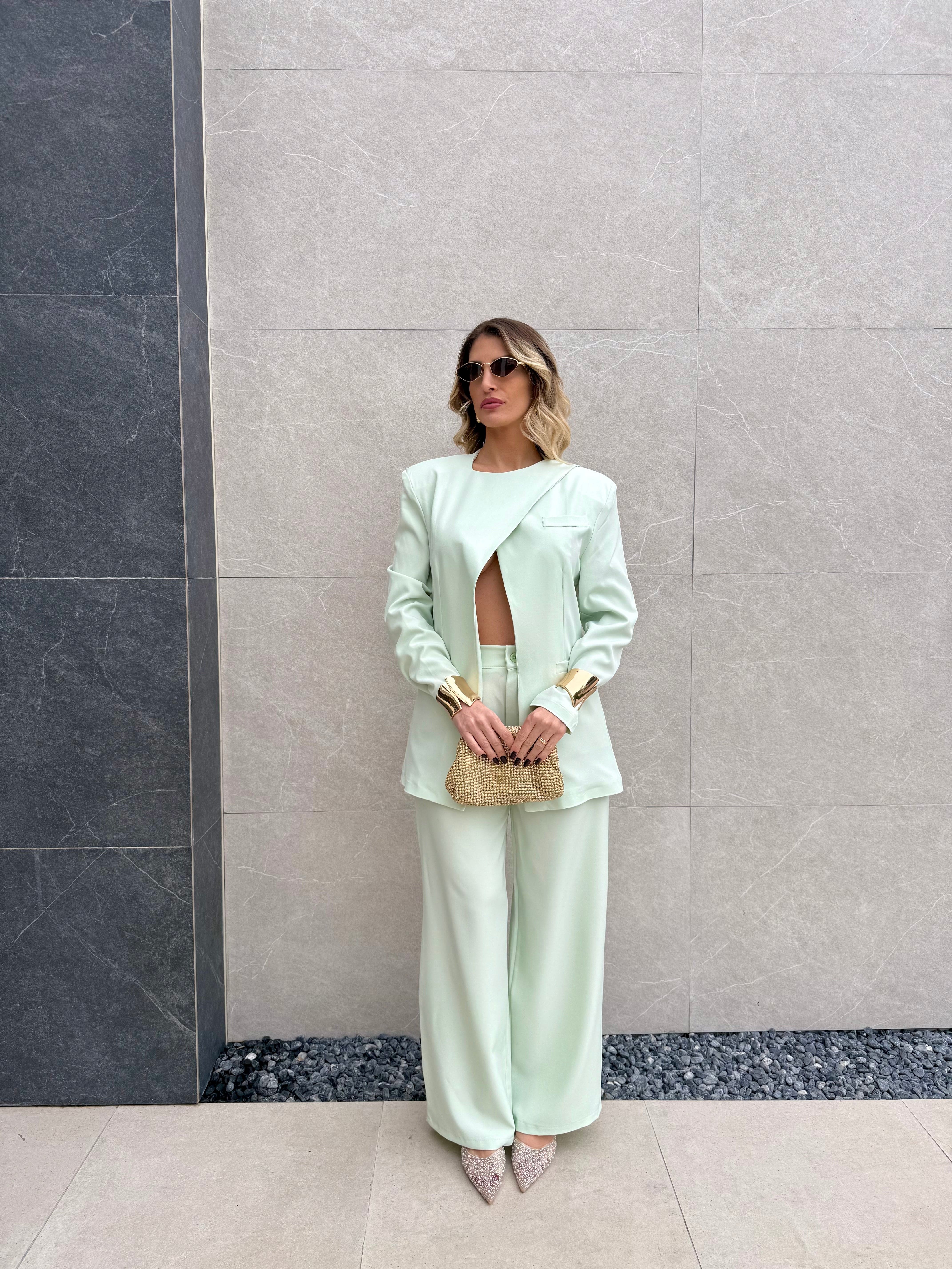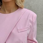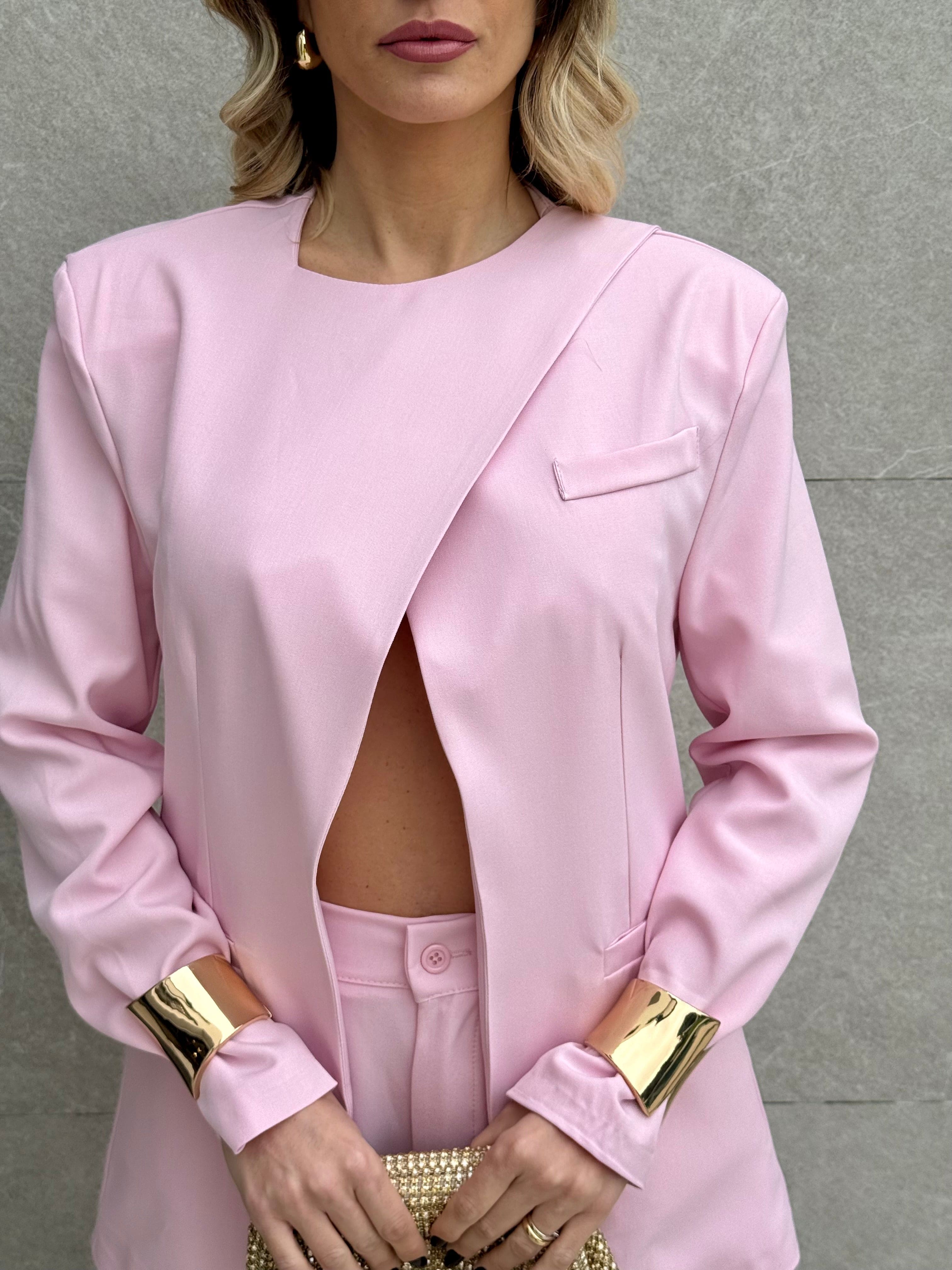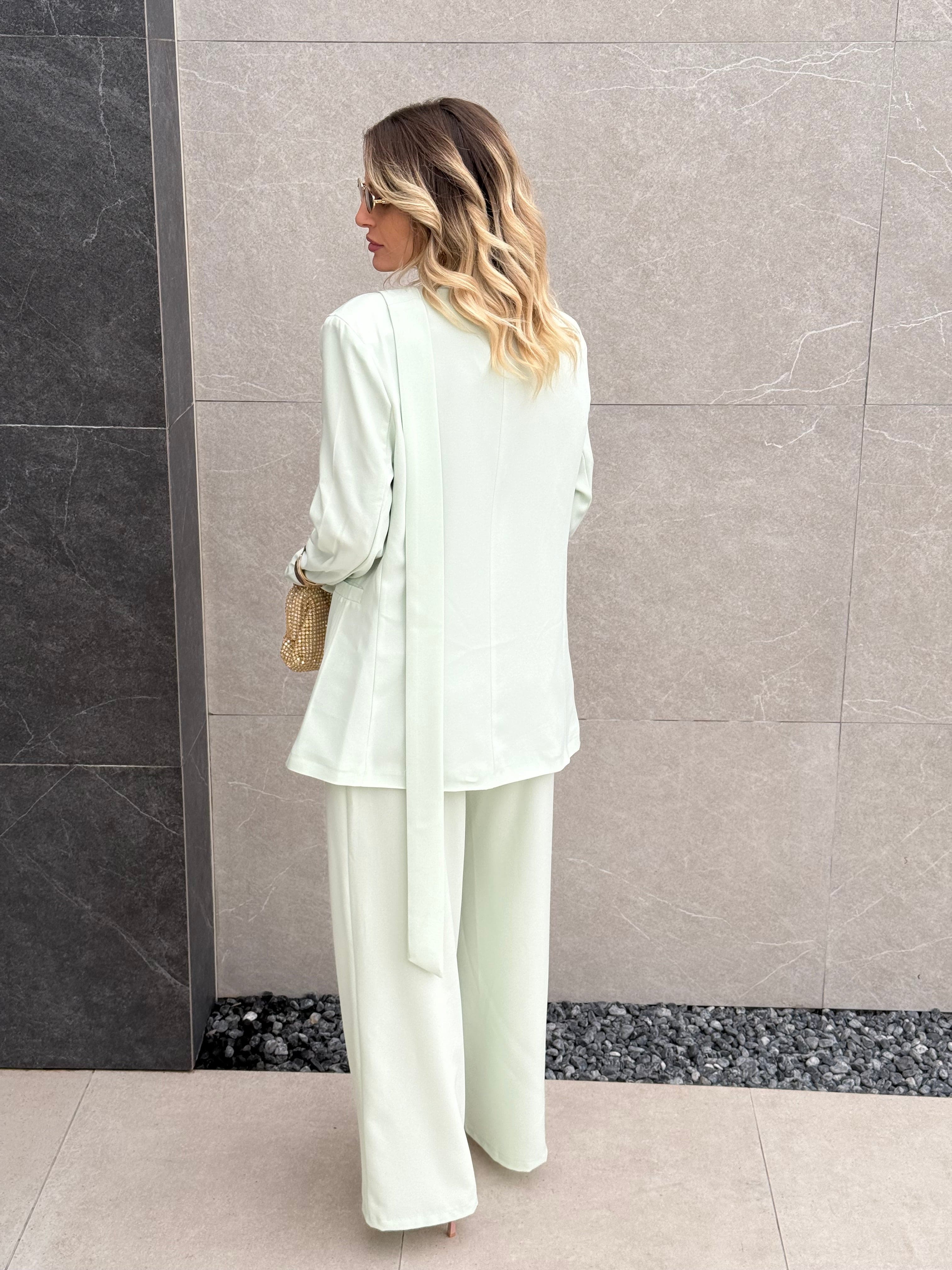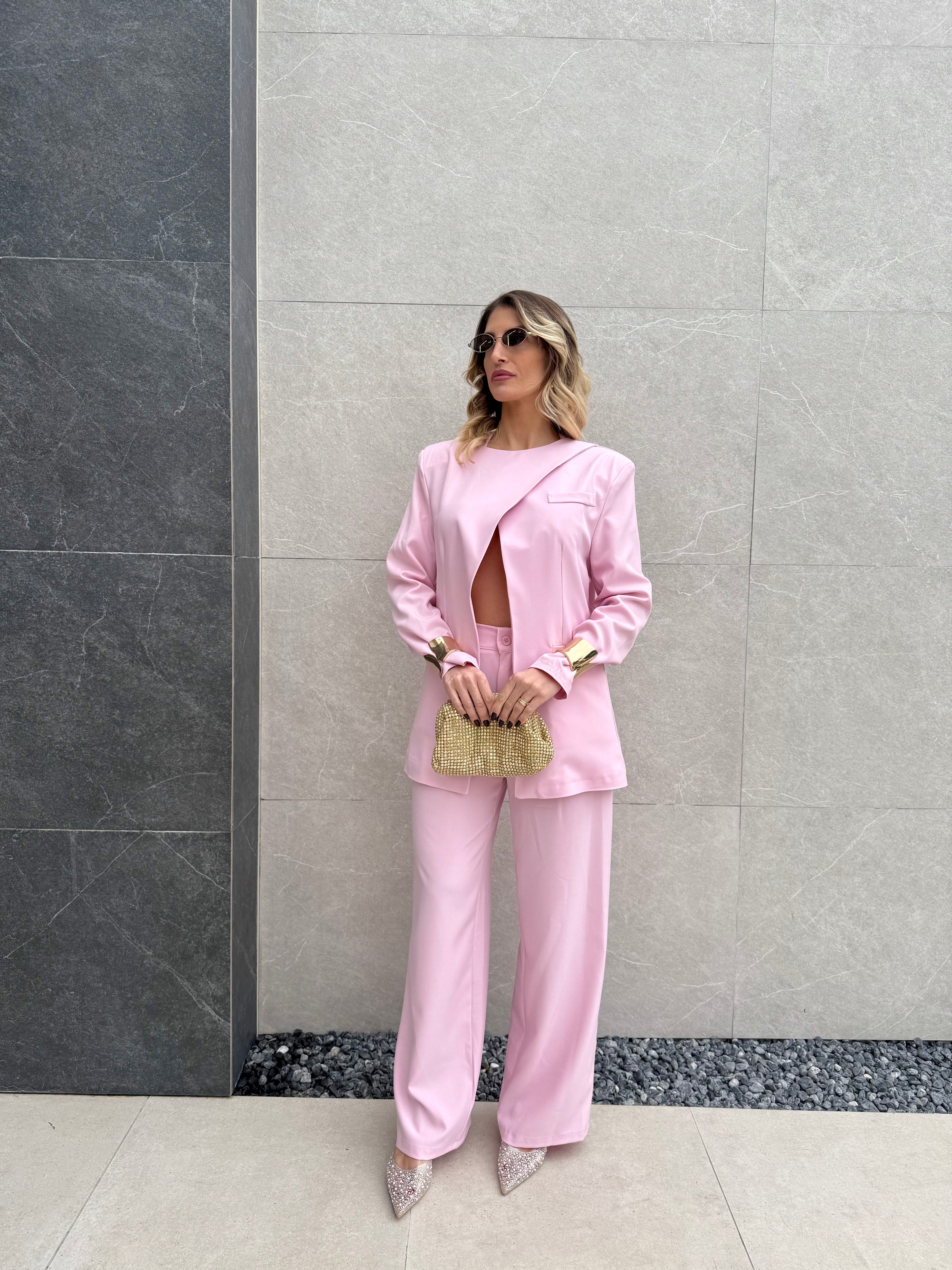 Tailleur composto da Blazer con spallina imbottita, bottone laterale sul collo e fusciacca che va sul retro.