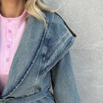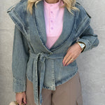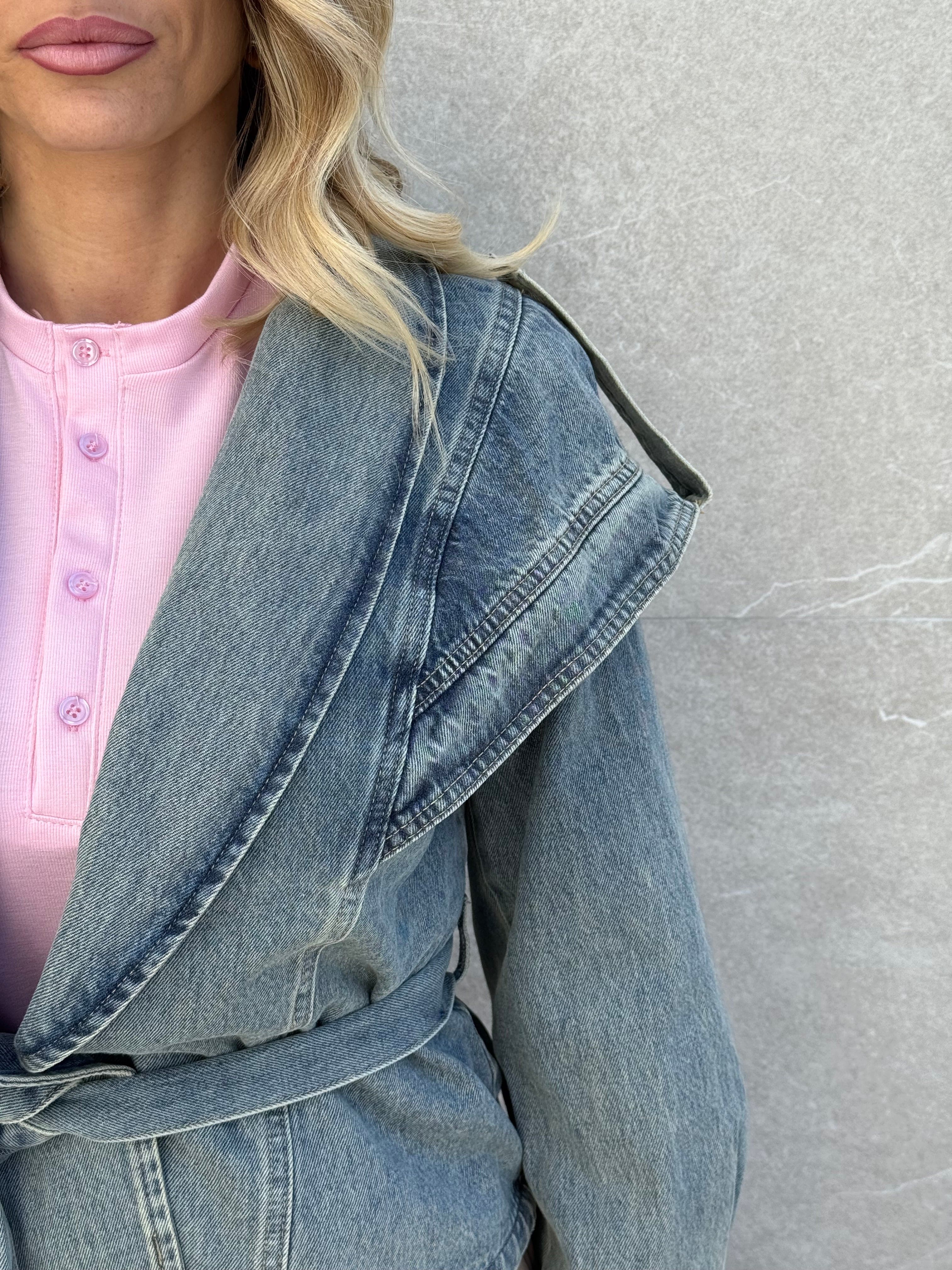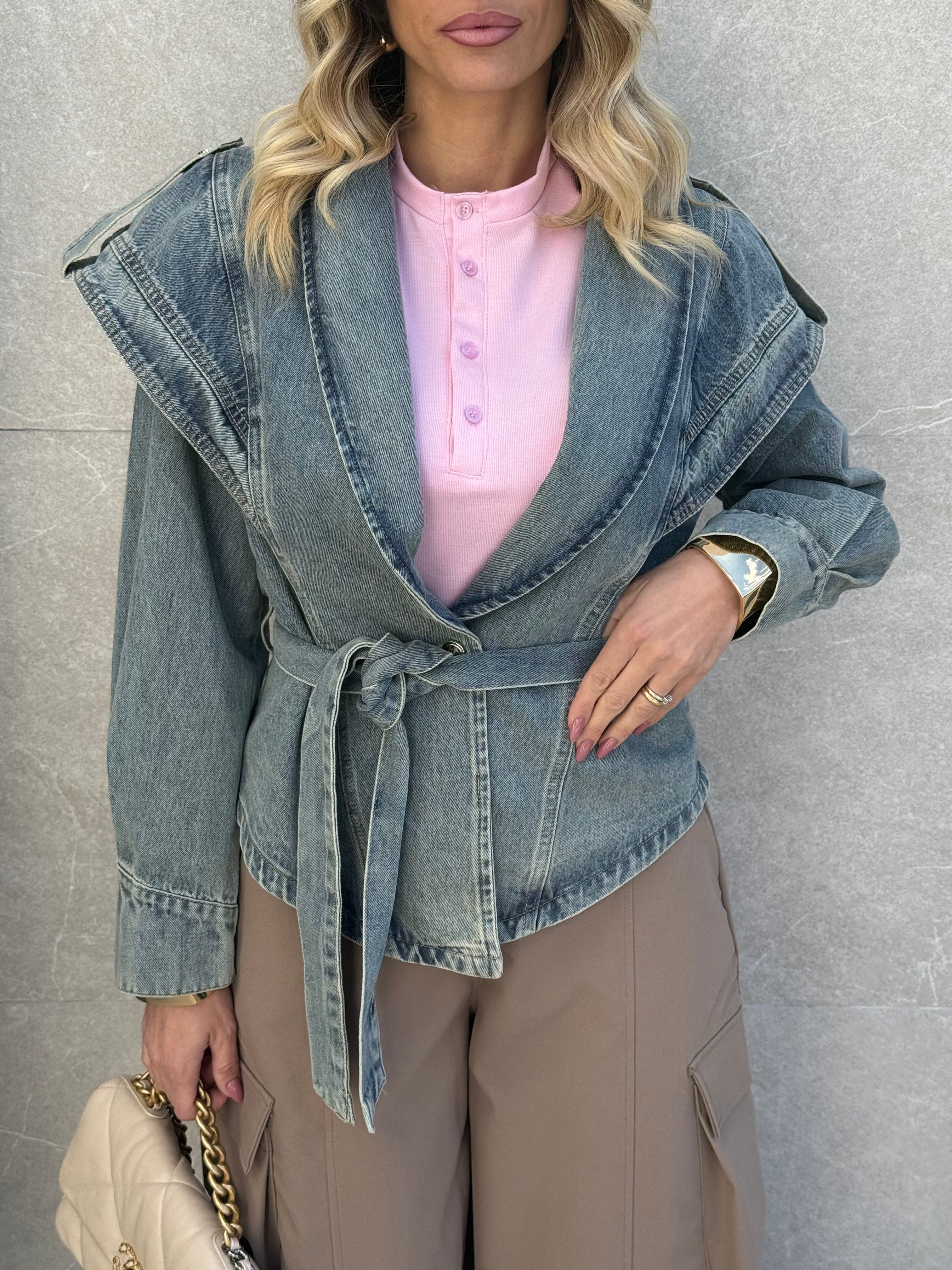 Giubbino in denim particolare con bottone e cintura.