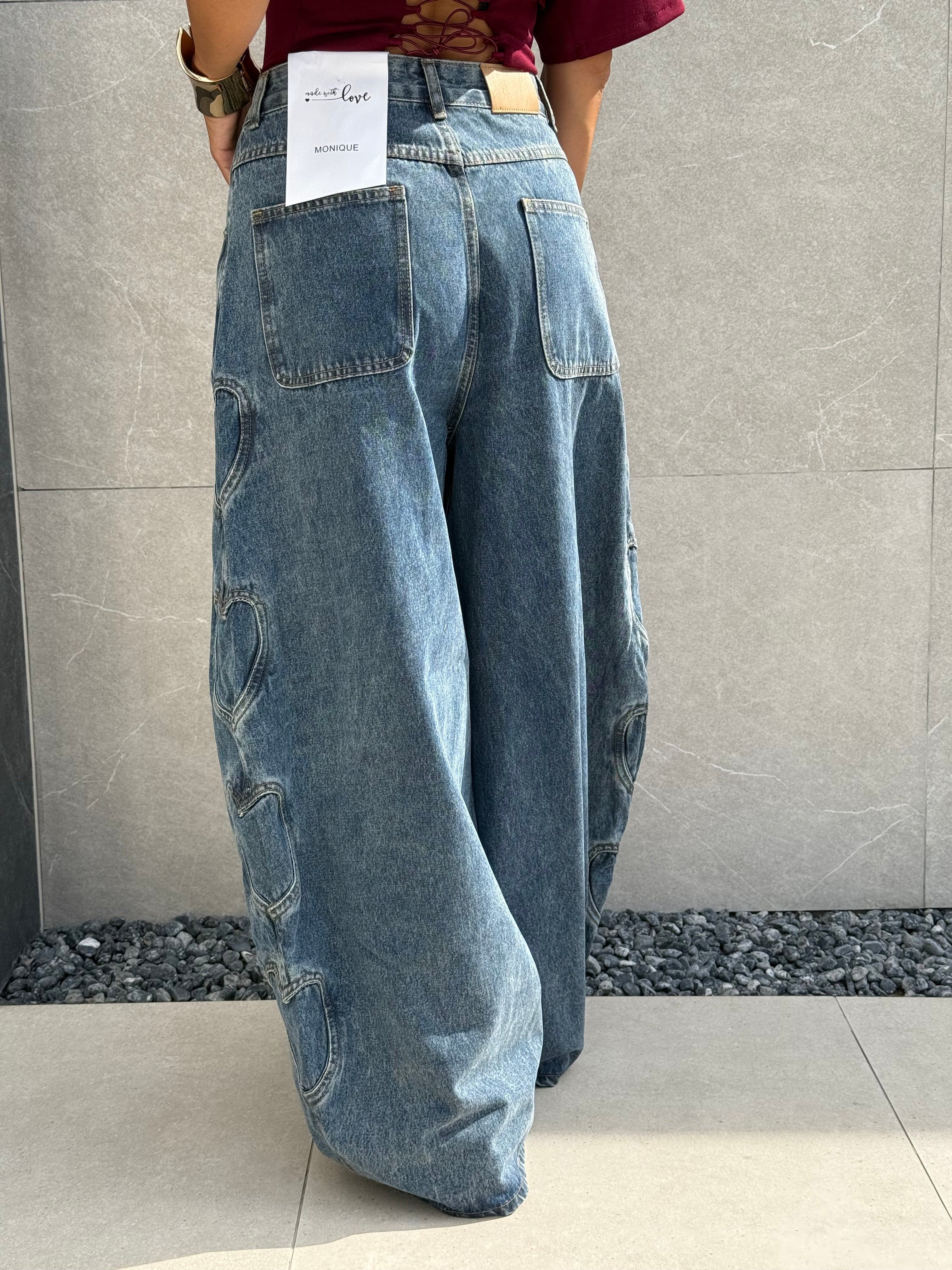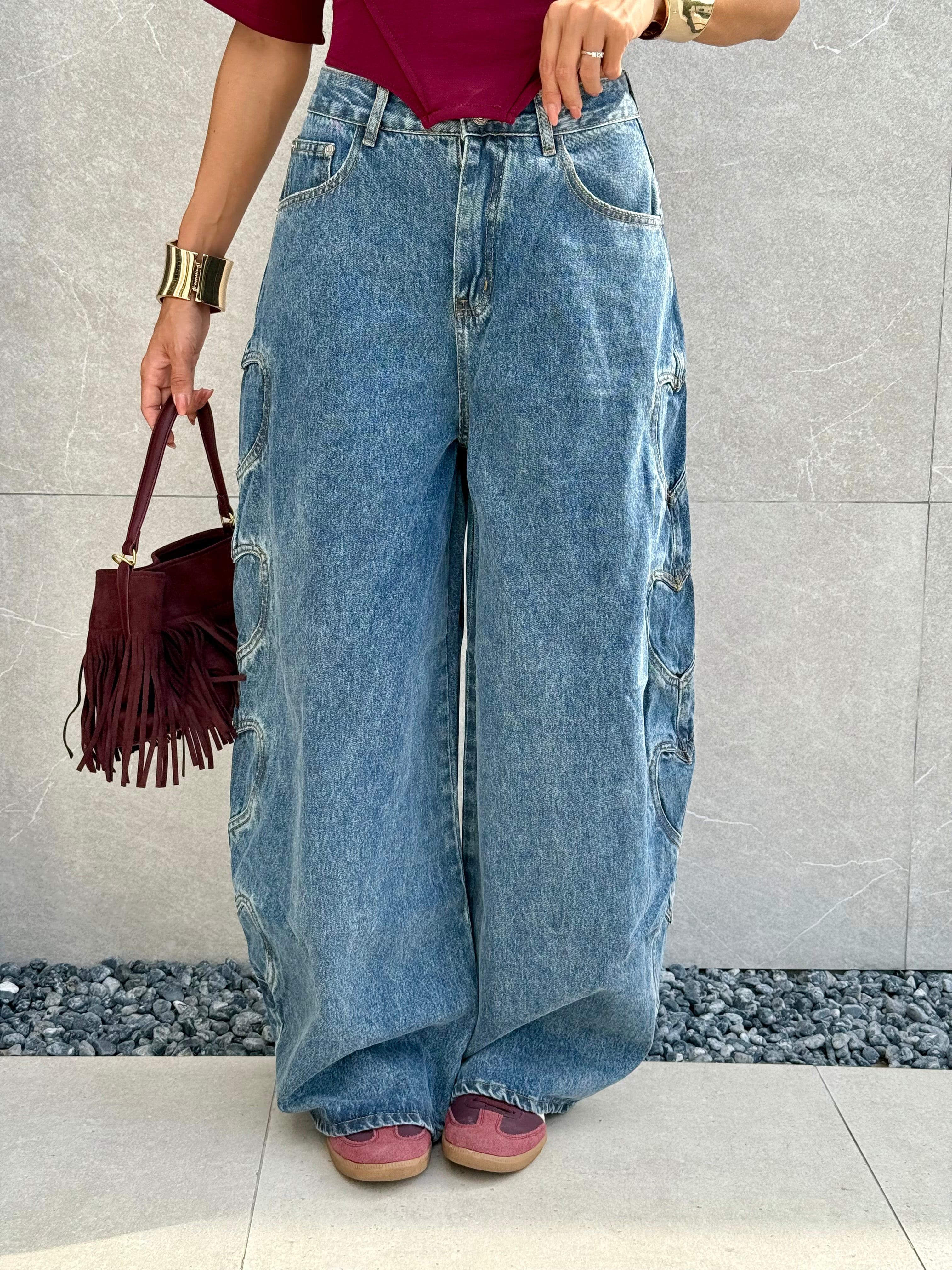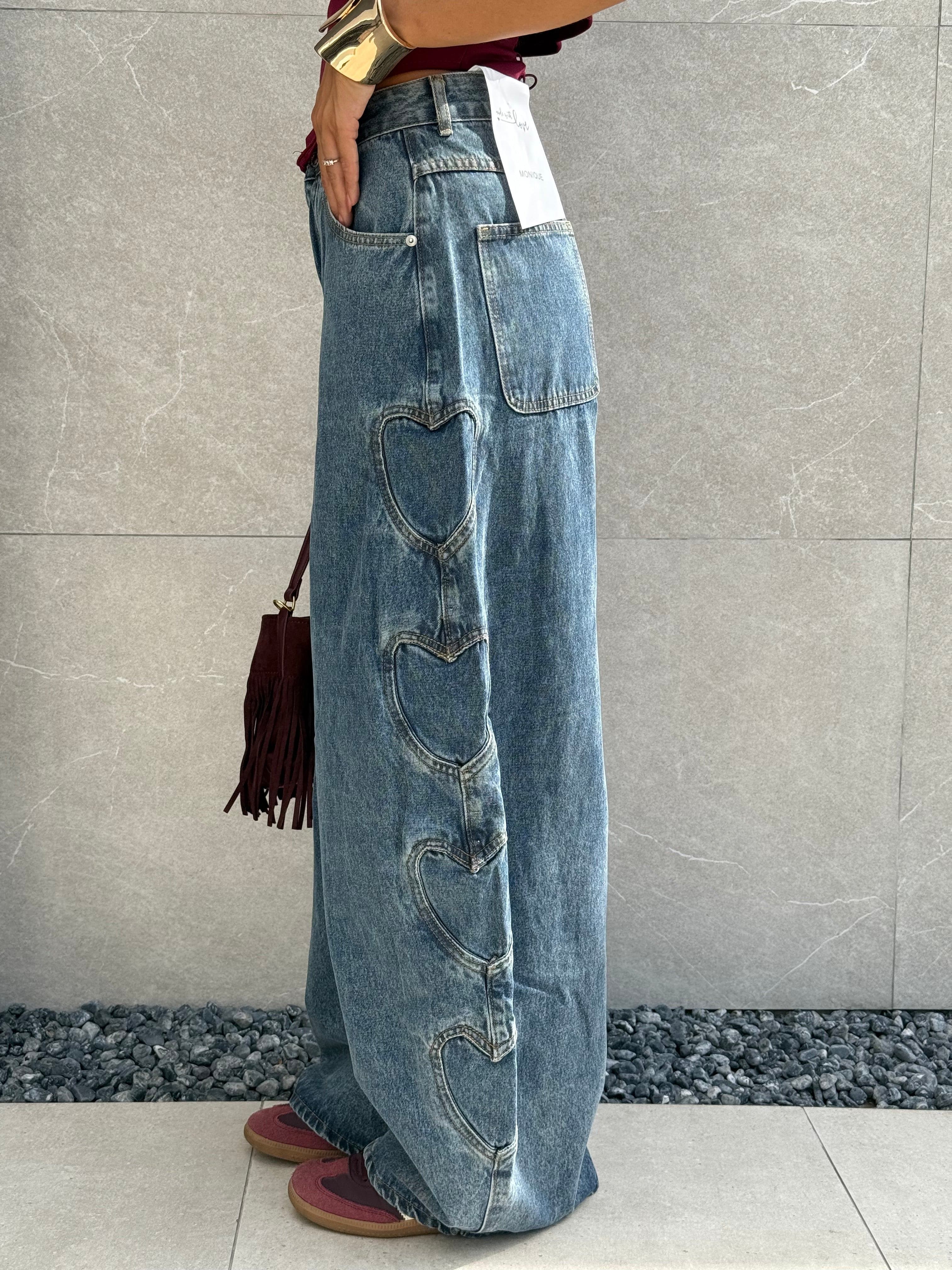 Jeans baggy premium quality con dettaglio cuori in rilievo sul laterale .