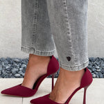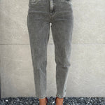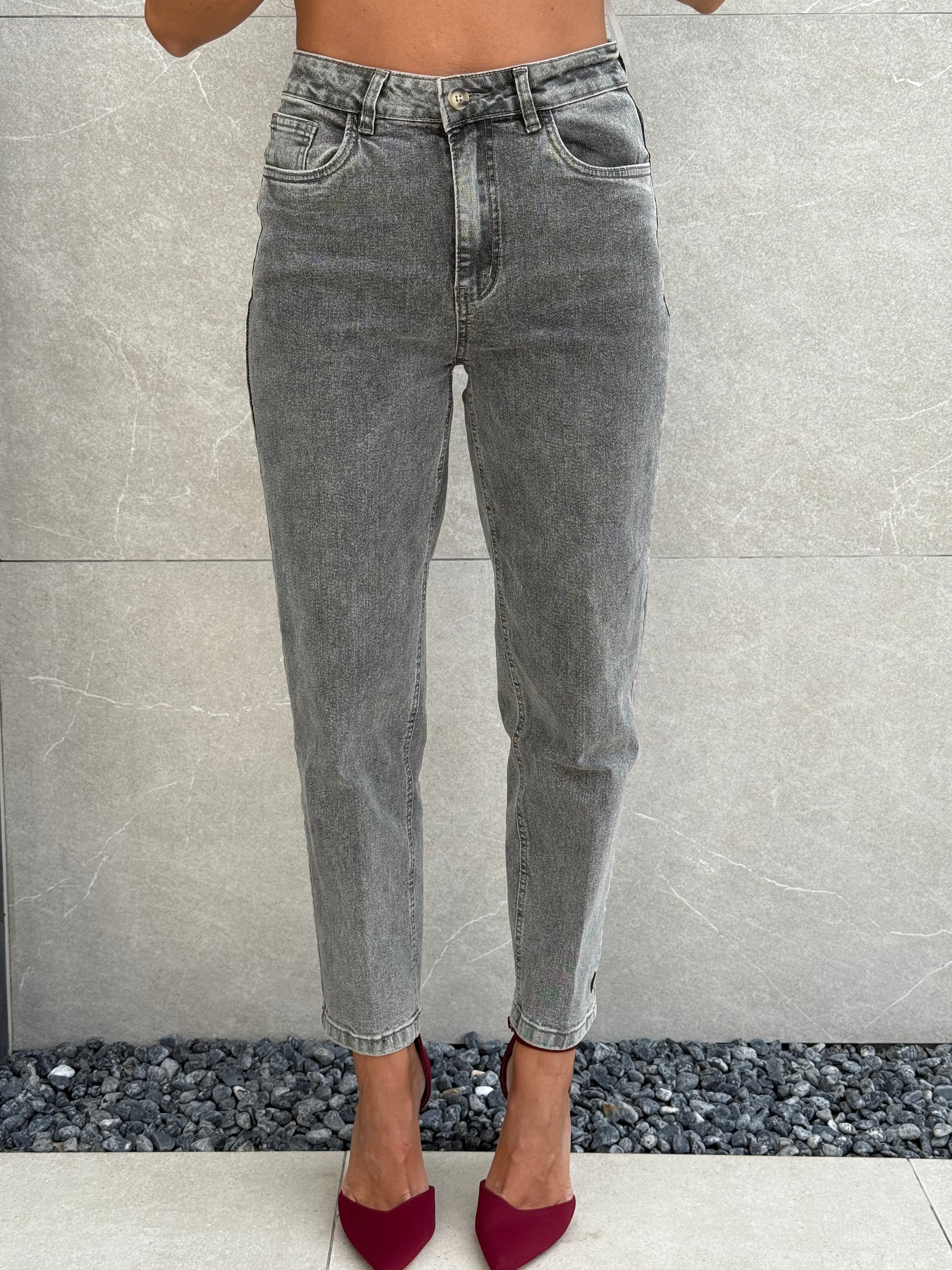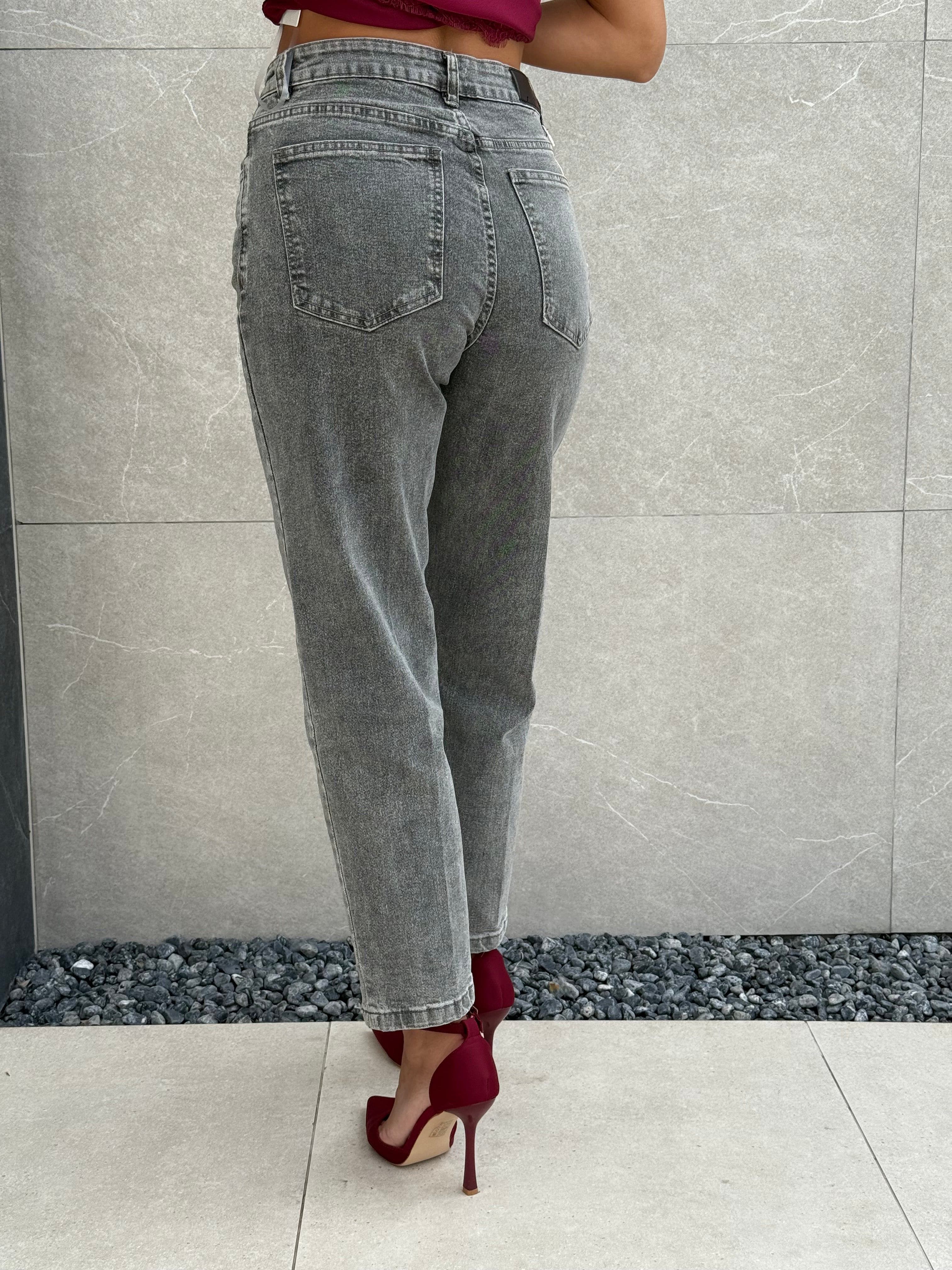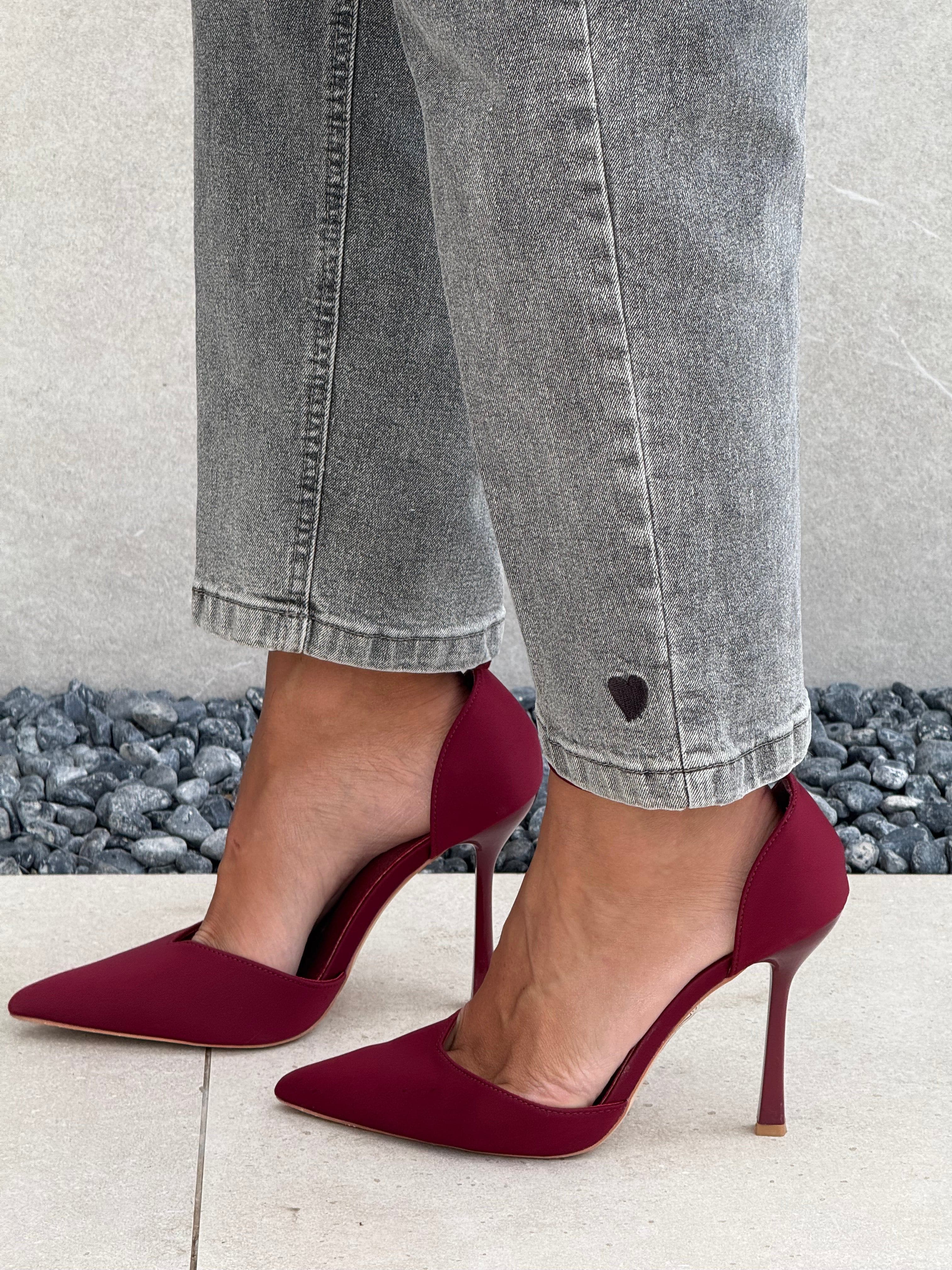 Jeans grigio con dettaglio cuore sul fondo.