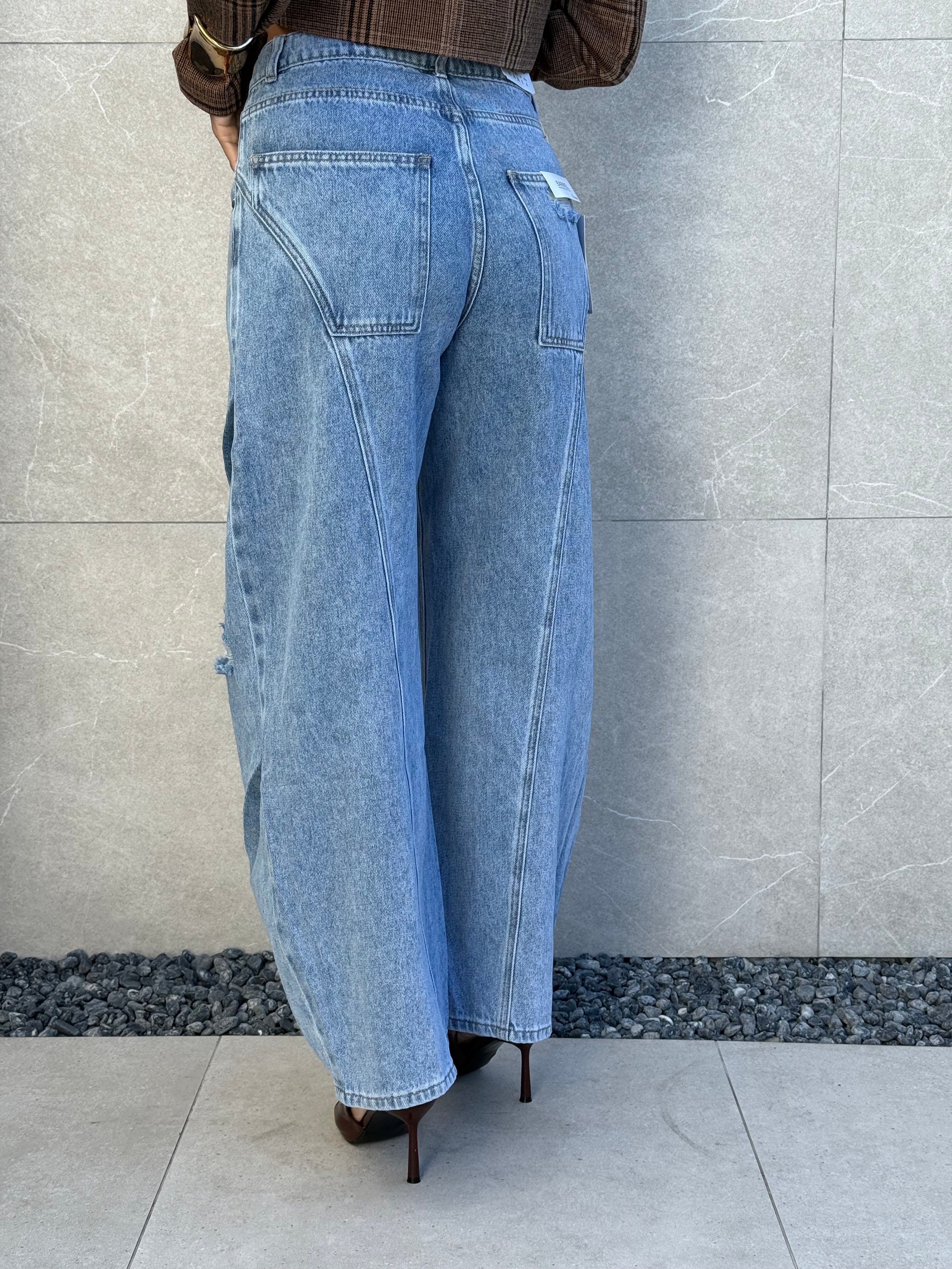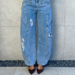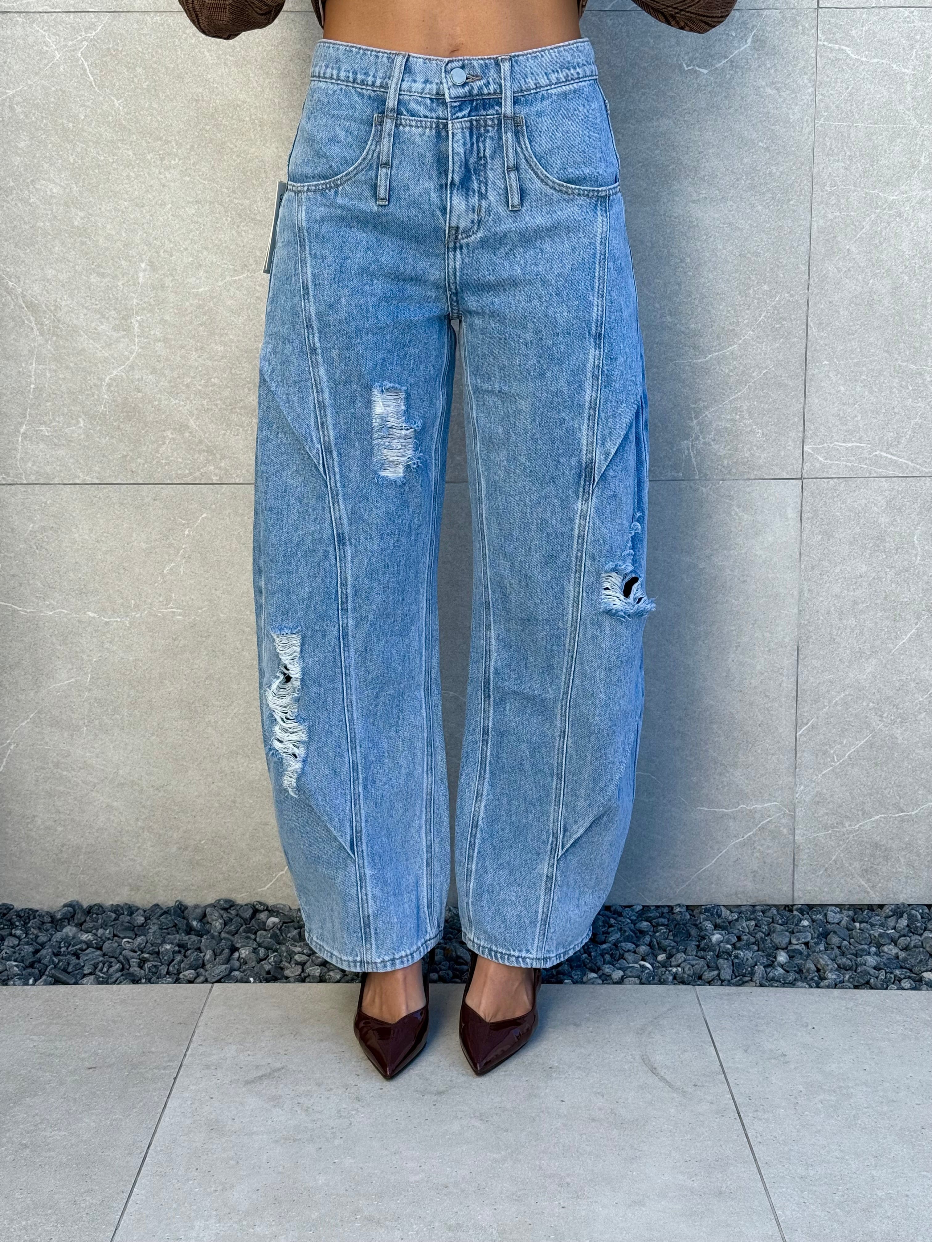 Jeans barrell lavaggio chiaro e strappi.