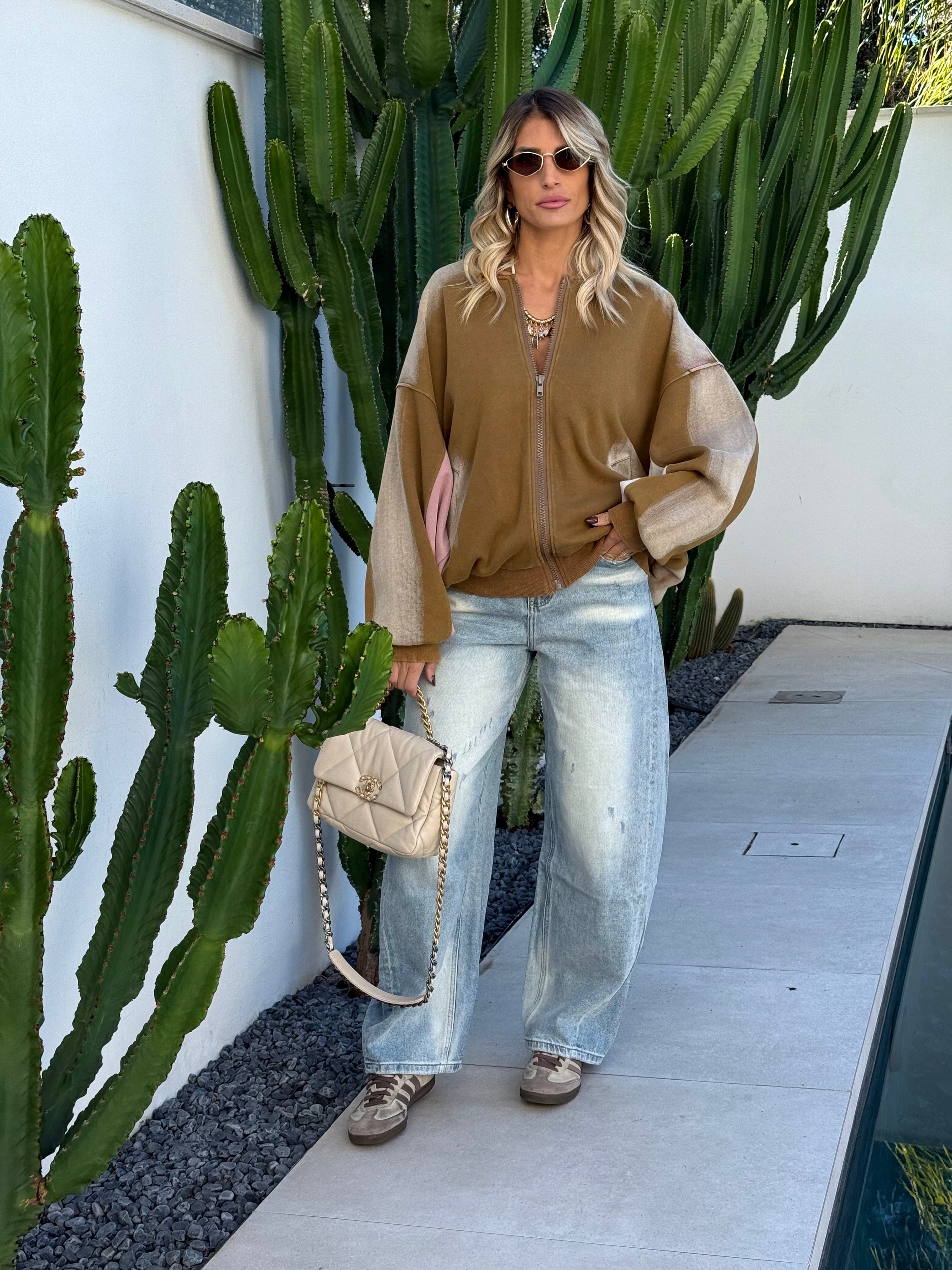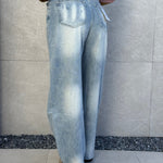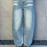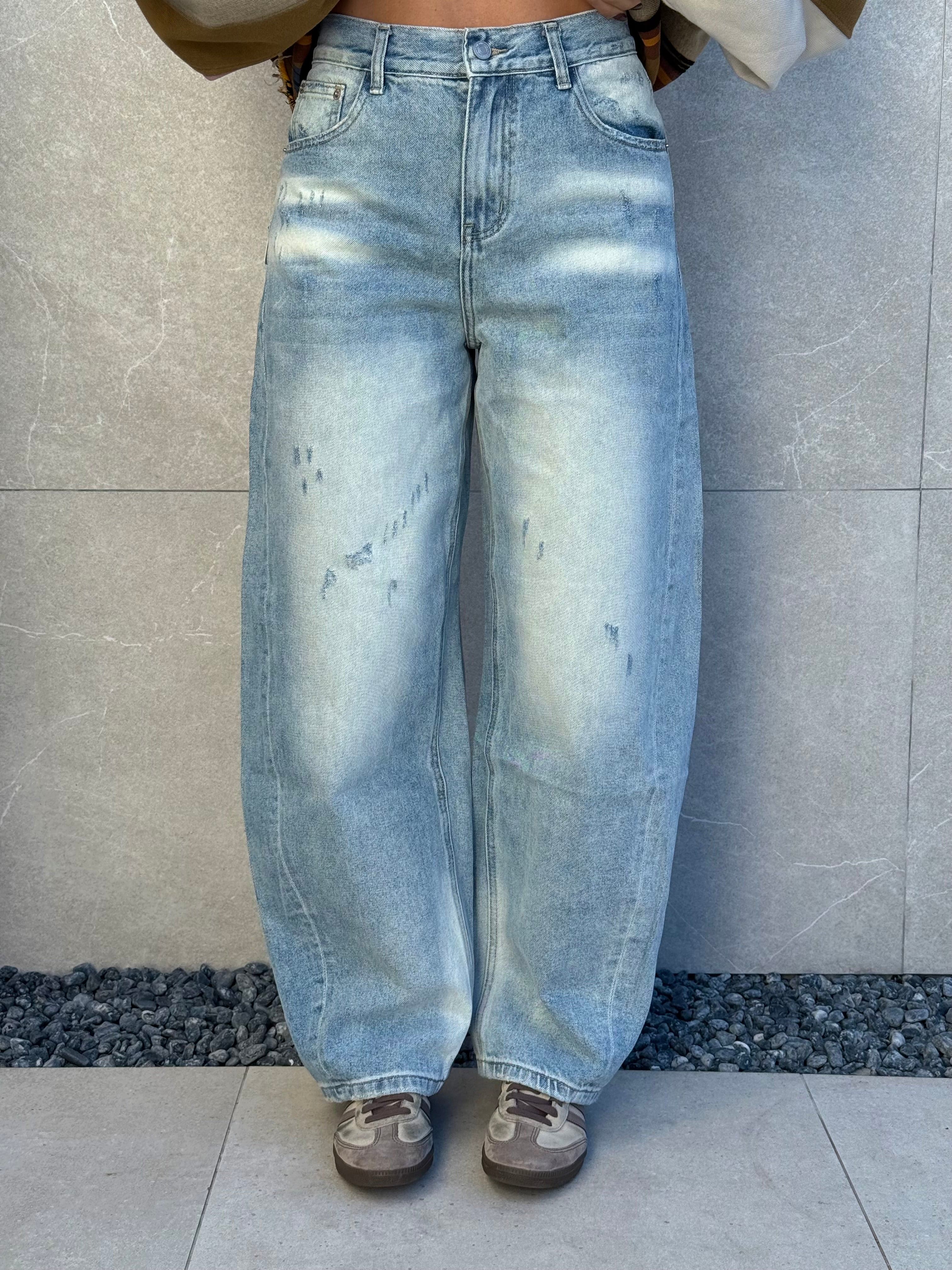 Jeans barrel push up, lavaggio chiaro e chiazze bianche.