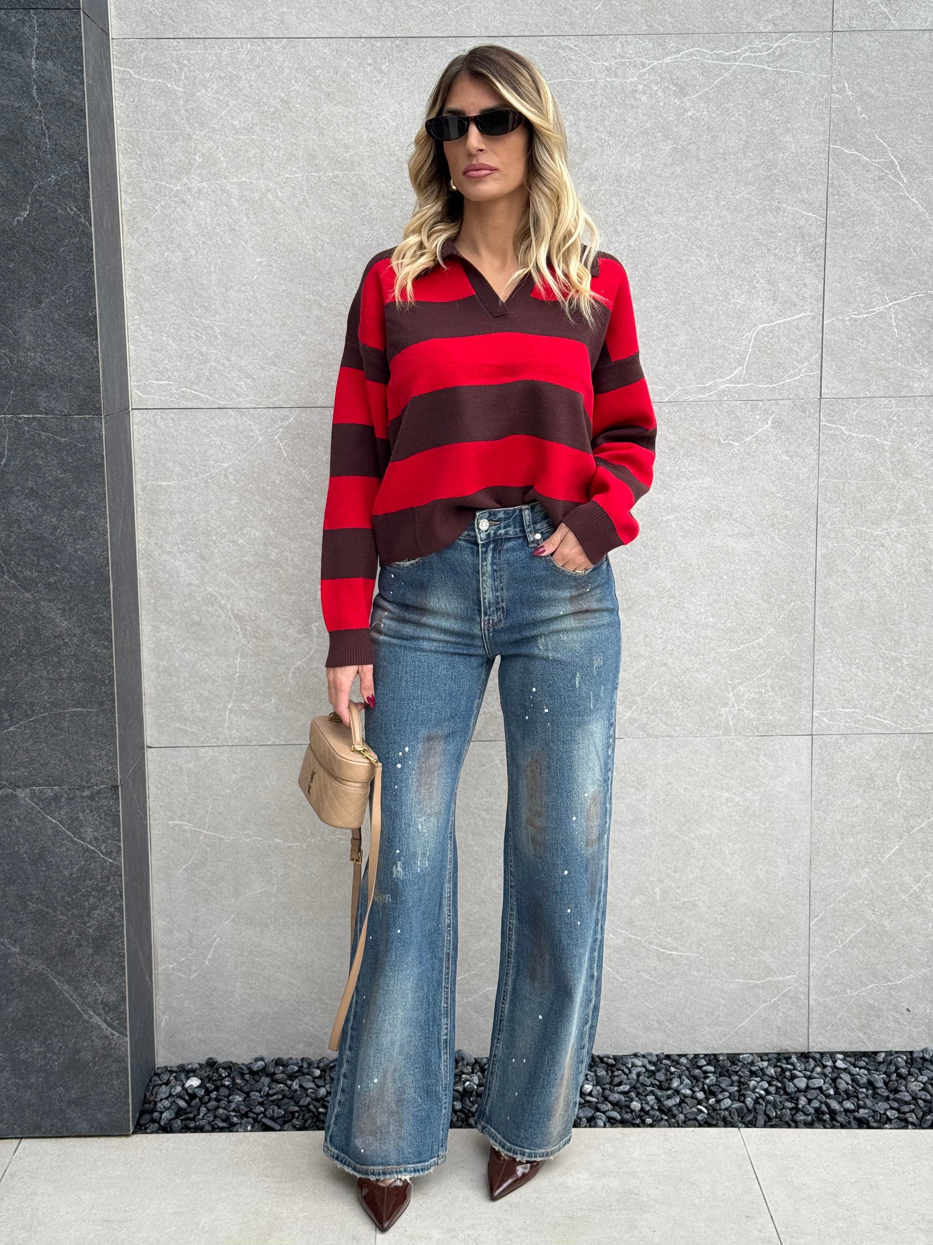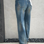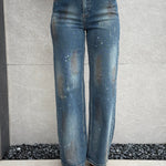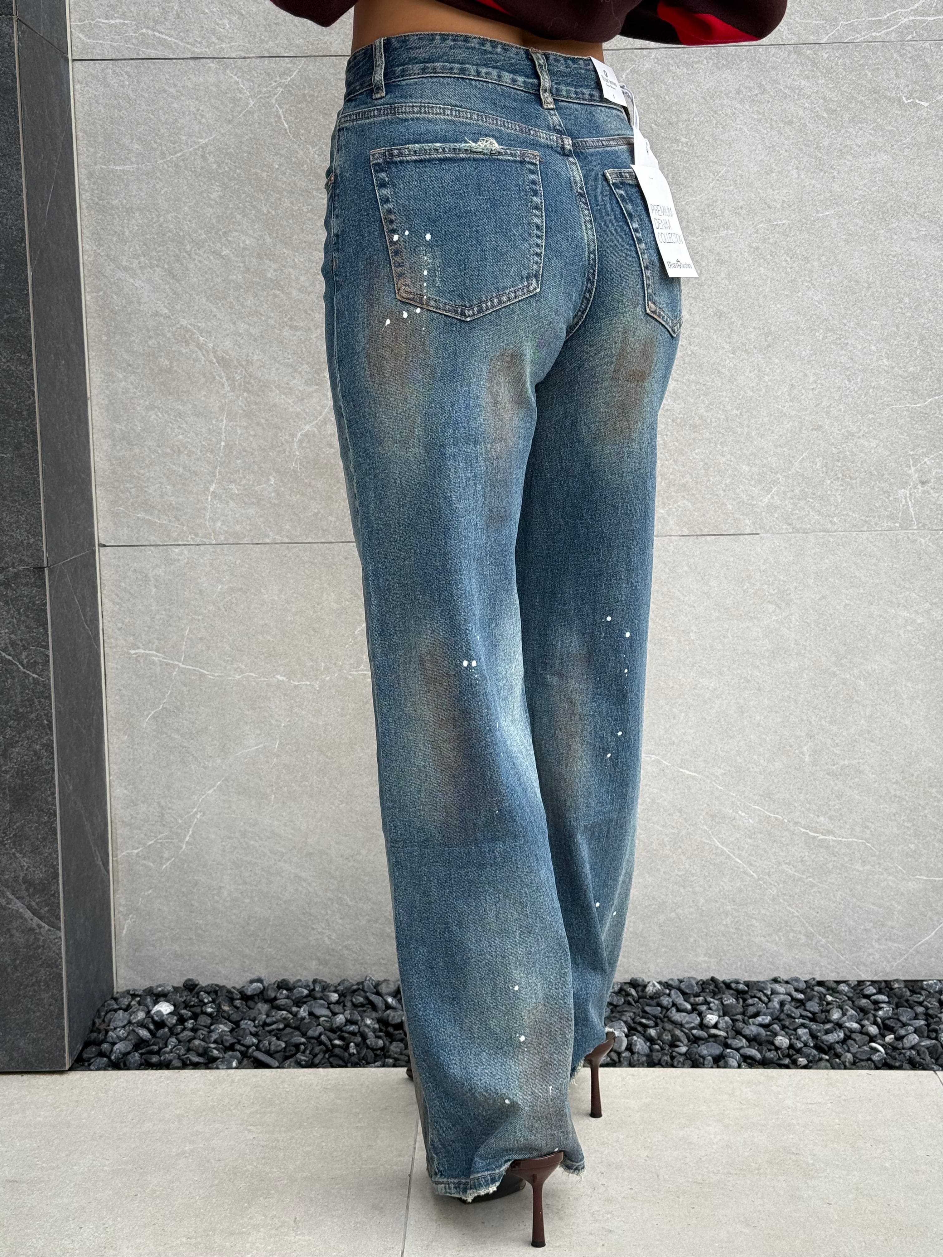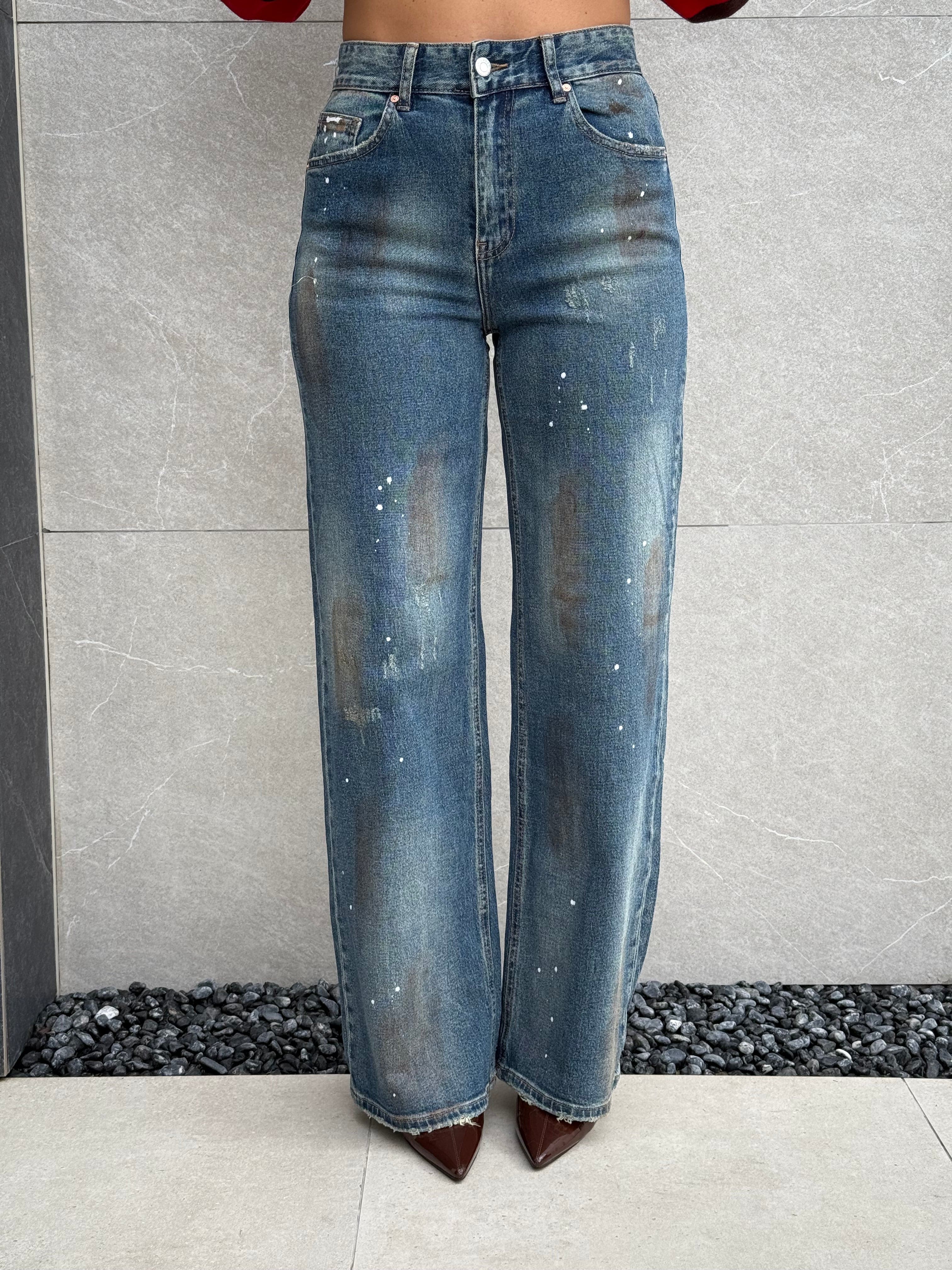 Jeans wide leg con schizzi di vernice bianco e marrone.