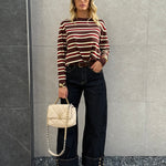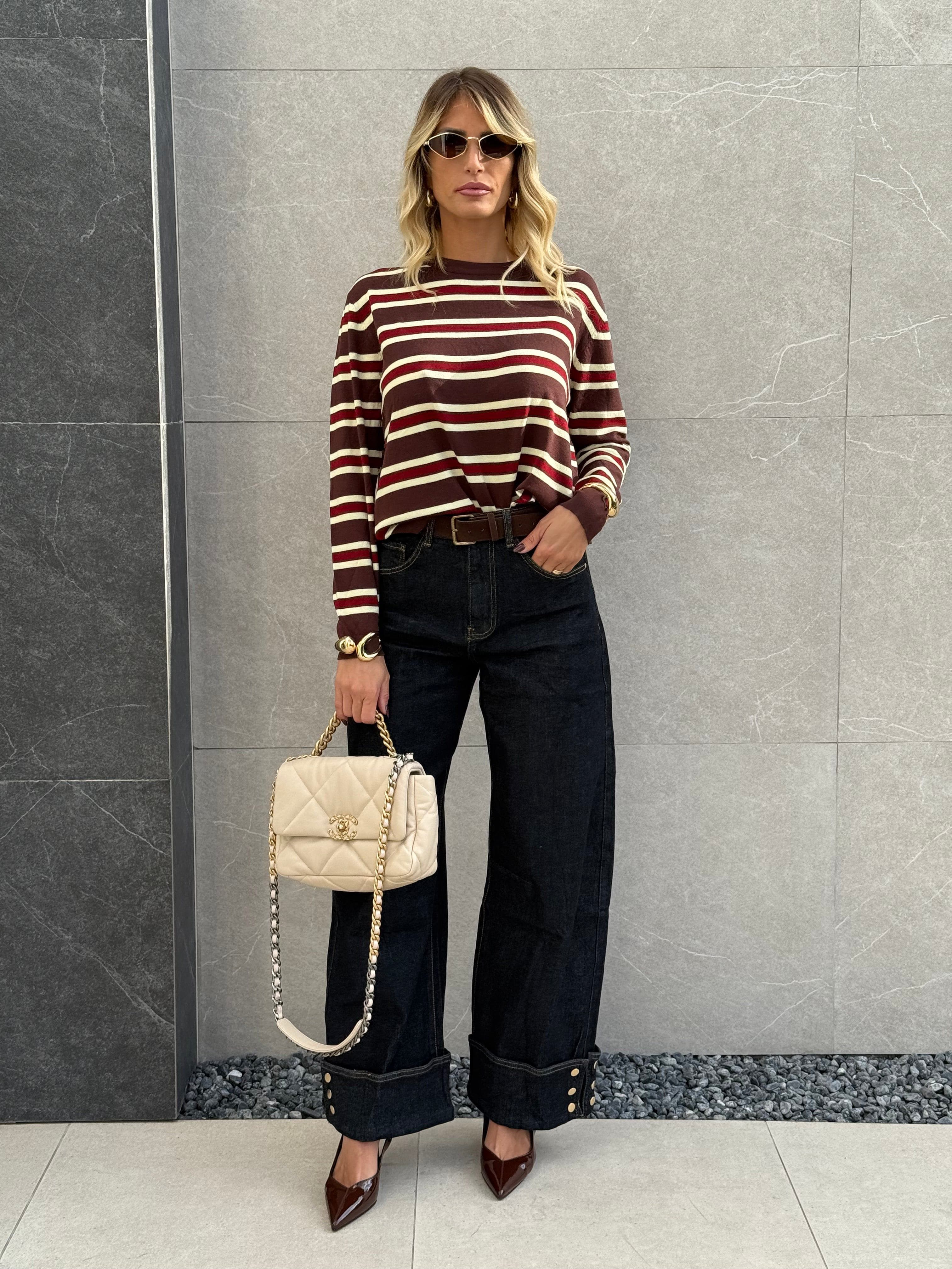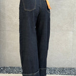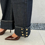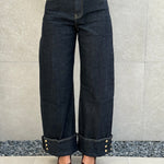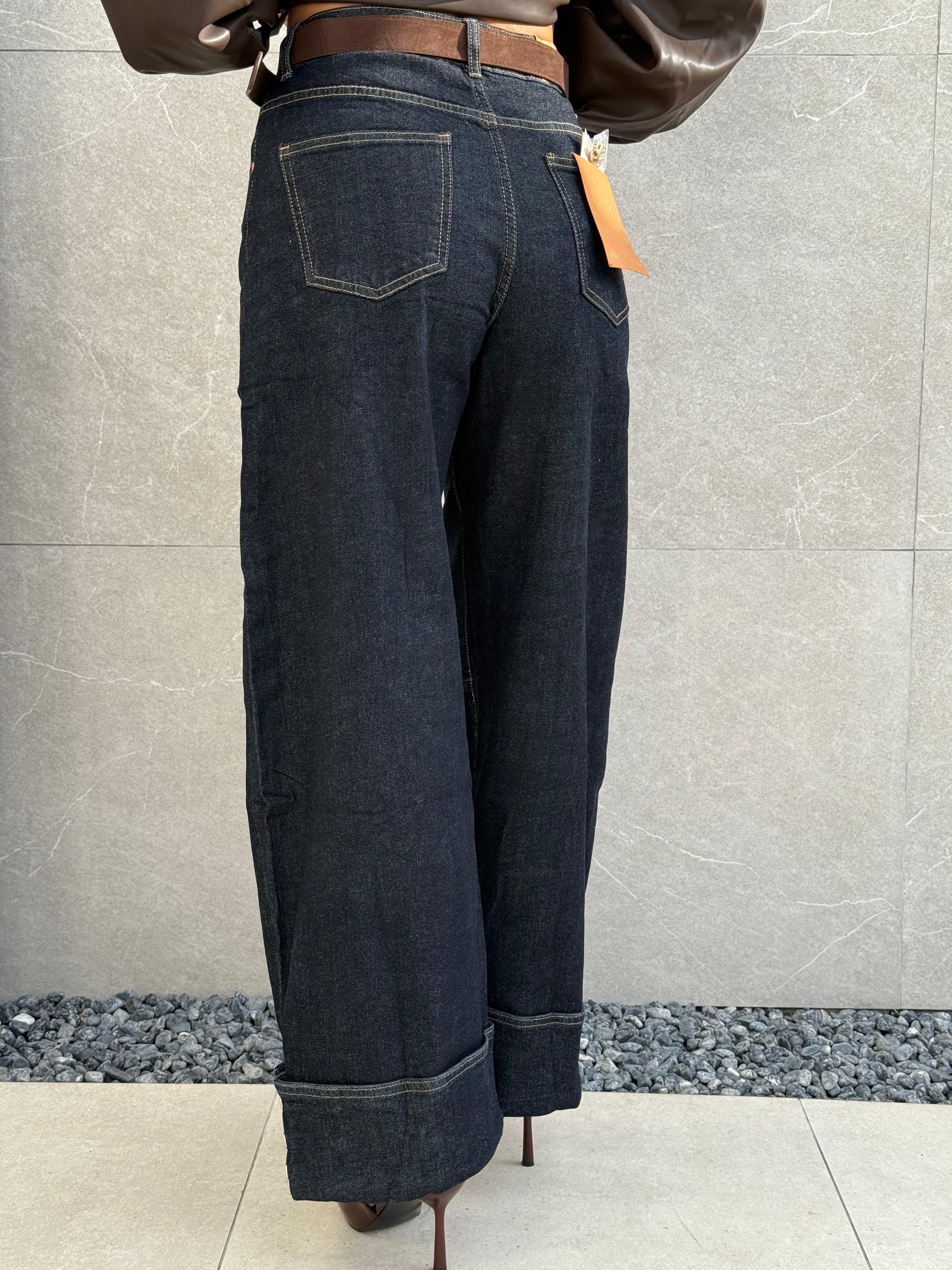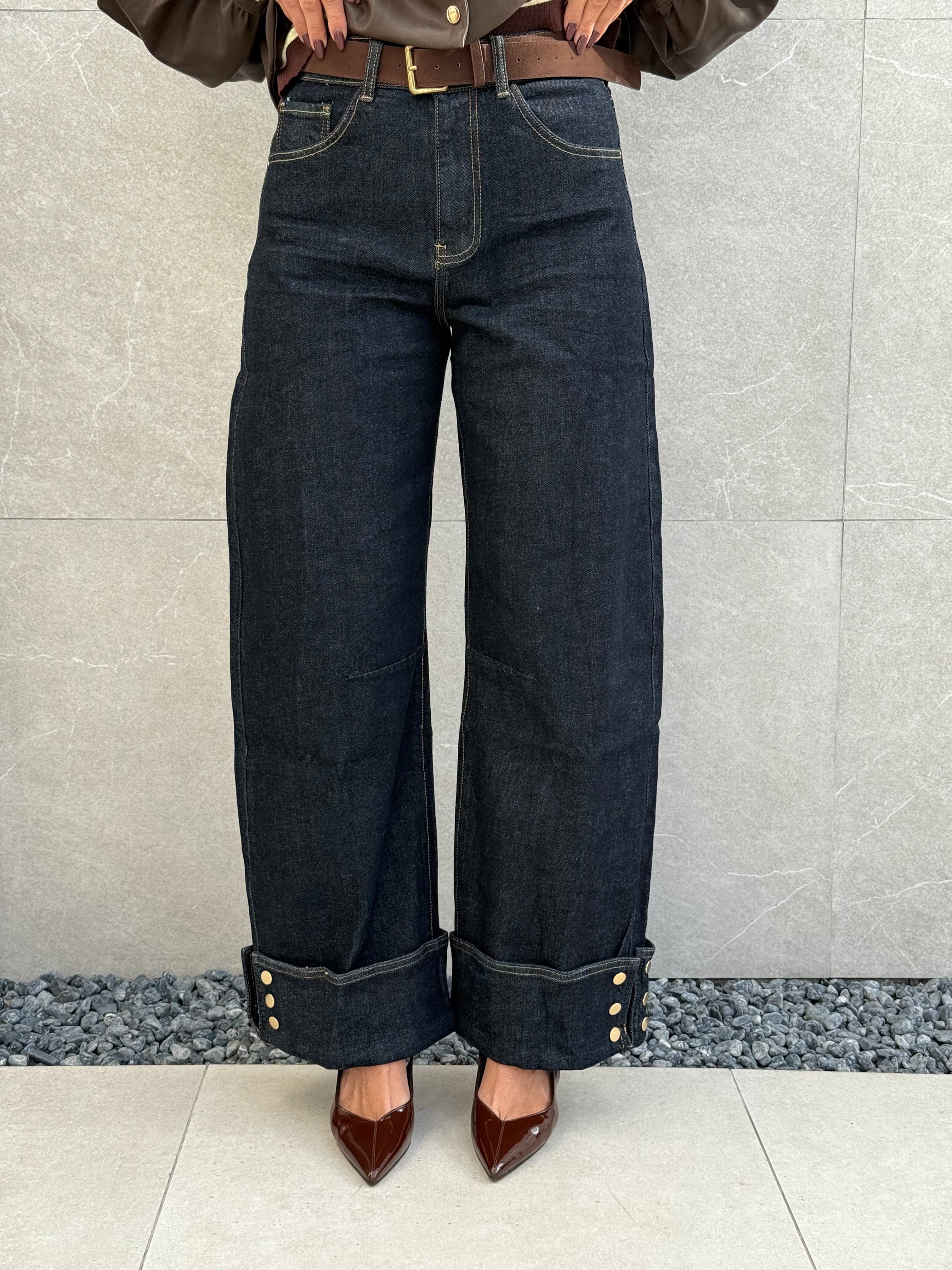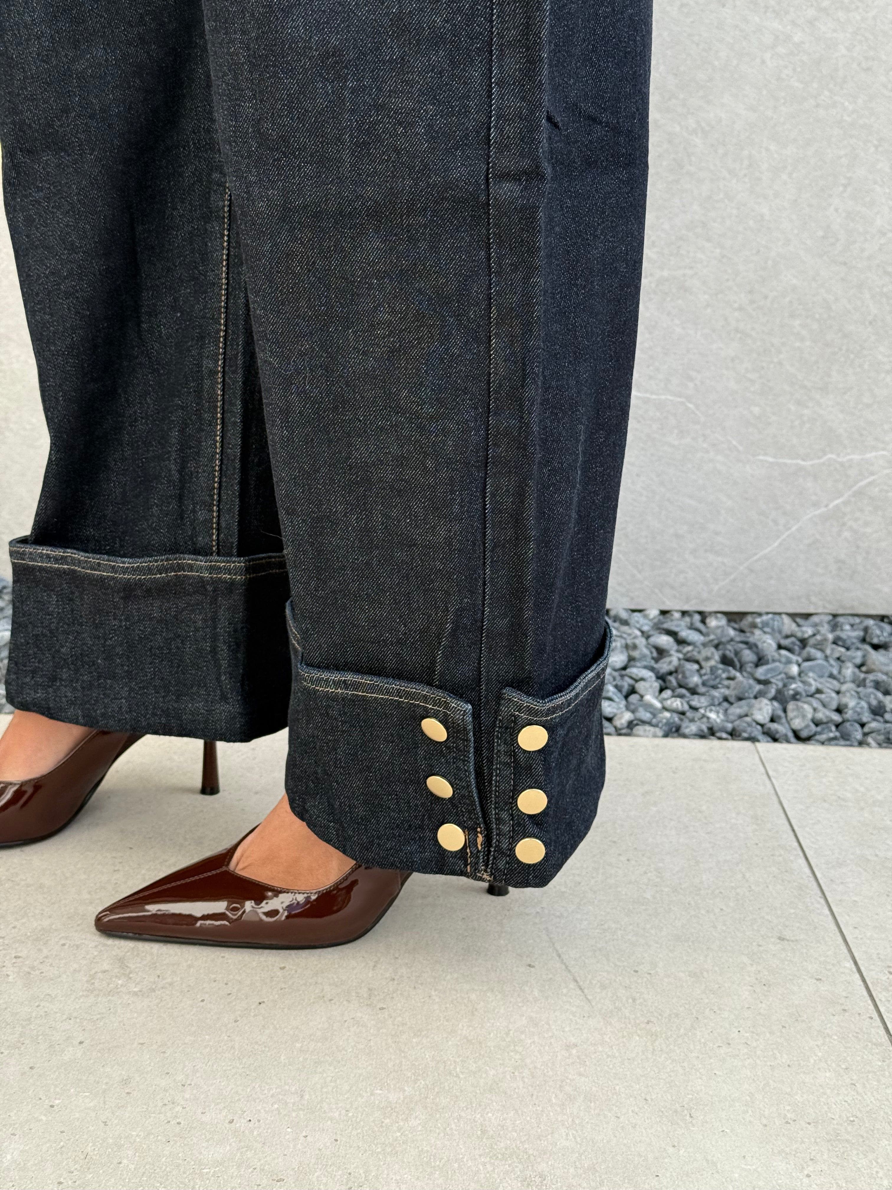 Jeans palazzo con piegone e bottoni sul fondo, cintura inclusa.